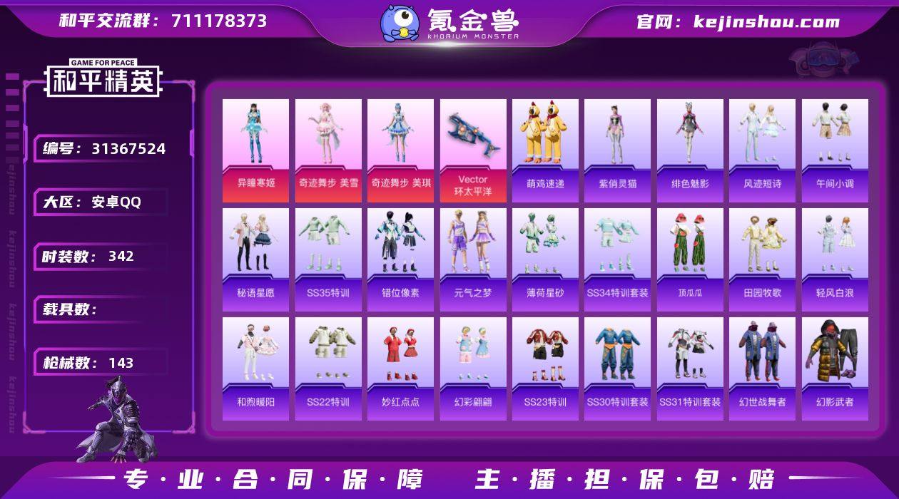 有地铁天赋【小丑鱼-3粉装-6特效枪】安卓手Q-2王牌印记-3粉装-6特效枪-43079热力值-85套装-143枪皮 【3粉装】角色-奇迹舞步 美雪,角色-奇迹舞步 美琪,角色-异瞳寒姬 【6特效枪】MG-36-幻彩电音/4级,MG-36-沧焰双生/5级,Kar98K-巳巳如意/5级,JS9-奇迹舞步/5级,Vector-环太平洋/7级,DP-28-豹影疾电/5级 【1稀有紫装】小丑鱼 【85稀有时装】奇迹舞步 美雪,奇迹舞步 美琪,异瞳寒姬,SS35特训,午间小调,SS31特训,SS36特训,SS34特训,小丑鱼,紫俏灵猫,炫彩糖果,绯色魅影,萌鸡速递,元气之梦,风迹短诗,错位像素,薄荷星砂,秘语星愿,顶瓜瓜,龙魂突击队,白糯汤圆,街头风暴,冰河战士,SS30特训,战术大师,智谋强哥,多纳泰罗,蝶变,巳巳如意,SS28特训,SS29特训,英勇保护者,军刀雅典娜,萌黄之夏,蓝色运动,黄色伏地魔,飞驰魅影,白色伏地魔,音速流光,酷萌兔限定,漫步者,黑色伏地魔,炫蓝之夏,竞技名士,猛禽,长空猛禽,甜蜜告白,街头潮人,冷焰舞者,魅力单车,猎梦纪元,甜心亚梦,虚音幻奏,幻世战舞者,暖心熊熊,牛气满满,萌趣咩咩,娇憨猪猪,麻辣教官,冰冻风暴,幻影武者,破蛋小黄鸡,千禧之恋,绮丽涂鸦,海岛探路者,和煦暖阳,田园牧歌,轻风白浪,探宝勇士,牛气冲天,熠彩粉晶,SS19特训,光之冒险,SS20特训,SS21特训,玉兔迎春,SS22特训,SS23特训,夏日倾情,缤纷果语,妙红点点,幻彩翩翩,海盐绵绵冰,王牌教练,柠萌假日 【142稀有枪械】DBS-乌木金纹,SCAR-L-海盐豹豹,GROZA-海盐豹豹,MG-36-沧焰双生/5级,MG-36-幻彩电音/4级,JS9-奇迹舞步/5级,Kar98K-巳巳如意/5级,DP-28-豹影疾电/5级,Mk14-冰河战士,UZI-冰河战士,M16A4-冰河战士,MK20-H-乌木金纹,Vector-环太平洋/7级,DBS-风迹短诗,莫辛纳甘-风迹短诗,Mini14-鸡智如我,M416-错位像素,AKM-绿洲时空,Win94-乌木金纹,