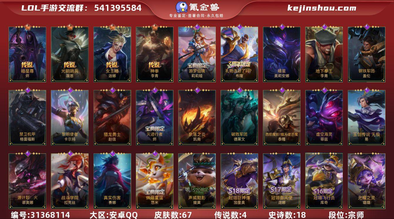 皮肤数:67 典藏皮肤数量:0 神话皮肤数量:0 传说皮肤数量:4 史诗皮肤数量:18 段位:宗师