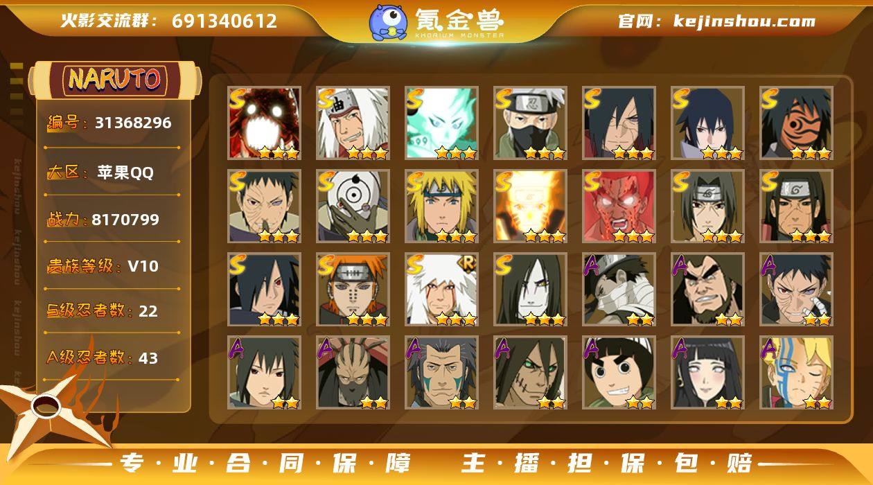 IOS/22S忍/43A忍/战力817W/V10/区服581 【S忍者】 宇智波带土「十尾人柱力」,宇智波佐助「漩涡鸣人」,宇智波斑「五影会谈」 ,宇智波斑「秽土转生·解」,宇智波佐助「永恒万花筒」,神秘面具男「红夜之刃」,漩涡鸣人「九喇嘛连结」,迈特凯「死门」,宇智波斑「木叶创立」,宇智波带土「忍界大战」,千手柱间「秽土转生」,自来也「舞之豪杰」,旗木卡卡西「须佐能乎」,大筒木舍人「最终章」,自来也「传说中的三忍」,漩涡鸣人「暴怒·第六尾」,宇智波斑「白面具」,宇智波鼬「须佐能乎」,佩恩「天道」,波风水门,大蛇丸,波风水门「九喇嘛连结」, 【A忍者】 机械鸣人「初始形态」,大野木「侠隐江湖」,巳月「仙人模式」,迈特凯「青春爆炸」,长十郎「六代目水影」,日向宁次「忍界大战」,漩涡博人「桃式显现」,日向雏田「最终章」,李洛克「忍界大战」,不动,蝎「绯流琥」,宇智波泉奈,宇智波带土「漂泊浪客」,神农「羁绊」,桃地再不斩「秽土转生」,角都「秽土转生」,长门「青年」,佩恩·六道「漂泊浪客」,艾「青年」,达鲁伊「五代目雷影」,波风水门「青年」,宇智波止水「新春限定」,宇智波佐助「须佐能乎」,旗木卡卡西「忍界大战」,漩涡鸣人「九尾查克拉」,千代「近松十人卫」,宇智波佐助「疾风传咒印」,秋道丁次「忍界大战」,春野樱「百豪」,宇智波佐助「万花筒写轮眼」,奇拉比,漩涡鸣人「仙人模式」,飞段「死司凭血」,飞段,迪达拉,我爱罗「疾风传」,蝎,干柿鬼鲛,宇智波鼬,猿飞阿斯玛,迈特凯, PX_2439866