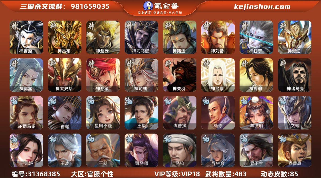 VIP等级: VIP18 官阶: 大将军 武将数量: 483 动态皮肤数量: 85 神将: 神曹操,神甘宁,神郭嘉,神刘备,神陆逊,神吕布,神司马懿,神孙策,神太史慈,神荀彧,神张辽,神赵云,神关羽,神吕蒙,神周瑜,神诸葛亮 魏国武将: 刘晔,戏志才,曹纯,曹婴,陈琳,程昱,郝昭,嵇康,界曹真,界于禁,界钟会,马钧,司马师,王朗,王凌,王元姬,文鸯,羊徽瑜,杨修,谋曹操,王粲,唐咨-魏,张辽,SP蔡文姬,SP曹仁,SP关羽,SP贾诩,SP姜维,SP庞德,卞夫人,曹昂,曹操,曹冲,曹洪,曹丕,曹仁,曹叡,曹嵩,贾逵,王异,张恭,鲁芝,界满宠,曹休,界曹植,满宠,荀攸,王基,钟繇,蒯越蒯良,郭嘉,牵招,荀彧,阮慧,杜畿,界郭嘉,崔琰,界曹丕,界荀彧,朱灵,界甄姬,辛毗,吕虔,界陈群,界王异,界许褚,界郭淮,华歆,陈群,界邓艾,界典韦,界曹休,谋甄姬,袁涣,李通,乐进,辛宪英,郭淮,毛玠,界曹彰,郭皇后,毌丘俭,夏侯惇,曹植,司马朗,谋于禁,界曹操,星周不疑,许褚,界张辽,谋徐晃,张郃,钟会,文聘,曹彰,界夏侯惇,诸葛诞,司马懿,甄姬,杨阜,界徐晃,徐晃,界曹仁,孙资刘放,韩浩史涣,曹真,典韦,界夏侯渊,夏侯渊,李典,于禁,王双,邓艾,界司马懿,张春华,孟达-魏,臧霸,牛金,朱灵(国战),曹髦,成济,玄·毌丘俭,李昭焦伯,SP司马昭,董昭 蜀国武将: 鲍三娘,董允,关索,花鬘,界黄忠,傅佥,谯周,沙摩柯,王平,张星彩,赵襄,周群,诸葛瞻,谋马超,谋赵云,谋夏侯氏,谋黄忠,马云騄,徐庶,界魏延,杨仪,谋刘备,吕凯,界关羽,界诸葛亮,邓芝,界伊籍,胡金定,费祎,严颜,界黄月英,界张嶷,赵云,张松,李丰,界刘备,谋法正,界刘禅,谋姜维,刘封,糜竺,蒋琬,谋庞统,黄月英,刘巴,关羽,王甫赵累,吴懿,界吴懿,界廖化,向宠,祝融,张飞,黄皓,陈震,魏延,界周仓,谋祝融,马忠,界法正,糜夫人,界孟获,刘禅,界赵云,界姜维,张翼,关银屏,界祝融,SP孙尚香,SP徐庶,卧龙诸葛,宗预,周仓,简雍,谋孟获,界关兴张苞,诸葛亮,孙乾,界张飞,界卧龙诸葛,法正,赵统赵广,陈到,...