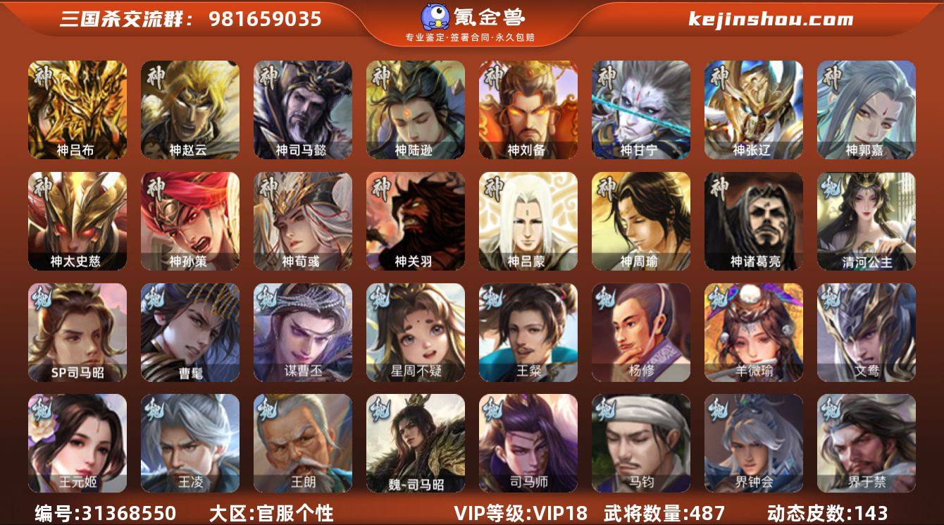 VIP等级: VIP18 官阶: 大将军 武将数量: 487 动态皮肤数量: 143 神将: 神甘宁,神郭嘉,神刘备,神陆逊,神吕布,神司马懿,神孙策,神太史慈,神荀彧,神张辽,神赵云,神关羽,神吕蒙,神周瑜,神诸葛亮 魏国武将: 刘晔,戏志才,曹纯,曹婴,陈琳,程昱,郝昭,嵇康,界曹真,界于禁,界钟会,马钧,司马师,魏-司马昭,王朗,王凌,王元姬,文鸯,羊徽瑜,杨修,王粲,唐咨-魏,张辽,SP蔡文姬,SP曹仁,SP关羽,SP贾诩,SP姜维,SP庞德,卞夫人,蔡贞姬,曹昂,曹操,曹冲,曹洪,曹丕,曹仁,曹叡,曹嵩,贾逵,王异,张恭,鲁芝,界满宠,曹休,界曹植,满宠,荀攸,王基,钟繇,蒯越蒯良,郭嘉,牵招,荀彧,阮慧,杜畿,界郭嘉,崔琰,界曹丕,界荀彧,朱灵,界甄姬,辛毗,吕虔,界陈群,界王异,界许褚,界郭淮,华歆,陈群,界邓艾,界典韦,界曹休,袁涣,李通,乐进,辛宪英,郭淮,毛玠,界曹彰,郭皇后,毌丘俭,夏侯惇,曹植,司马朗,谋于禁,界曹操,星周不疑,许褚,界张辽,谋徐晃,张郃,钟会,文聘,曹彰,界夏侯惇,诸葛诞,司马懿,甄姬,界徐晃,徐晃,界曹仁,孙资刘放,韩浩史涣,胡班,曹真,谋曹丕,典韦,界夏侯渊,夏侯渊,李典,于禁,王双,邓艾,界司马懿,张春华,孟达-魏,臧霸,牛金,朱灵(国战),曹髦,玄·毌丘俭,清河公主,SP司马昭,董昭,谋张辽,王经,谋夏侯渊 蜀国武将: 董允,关...