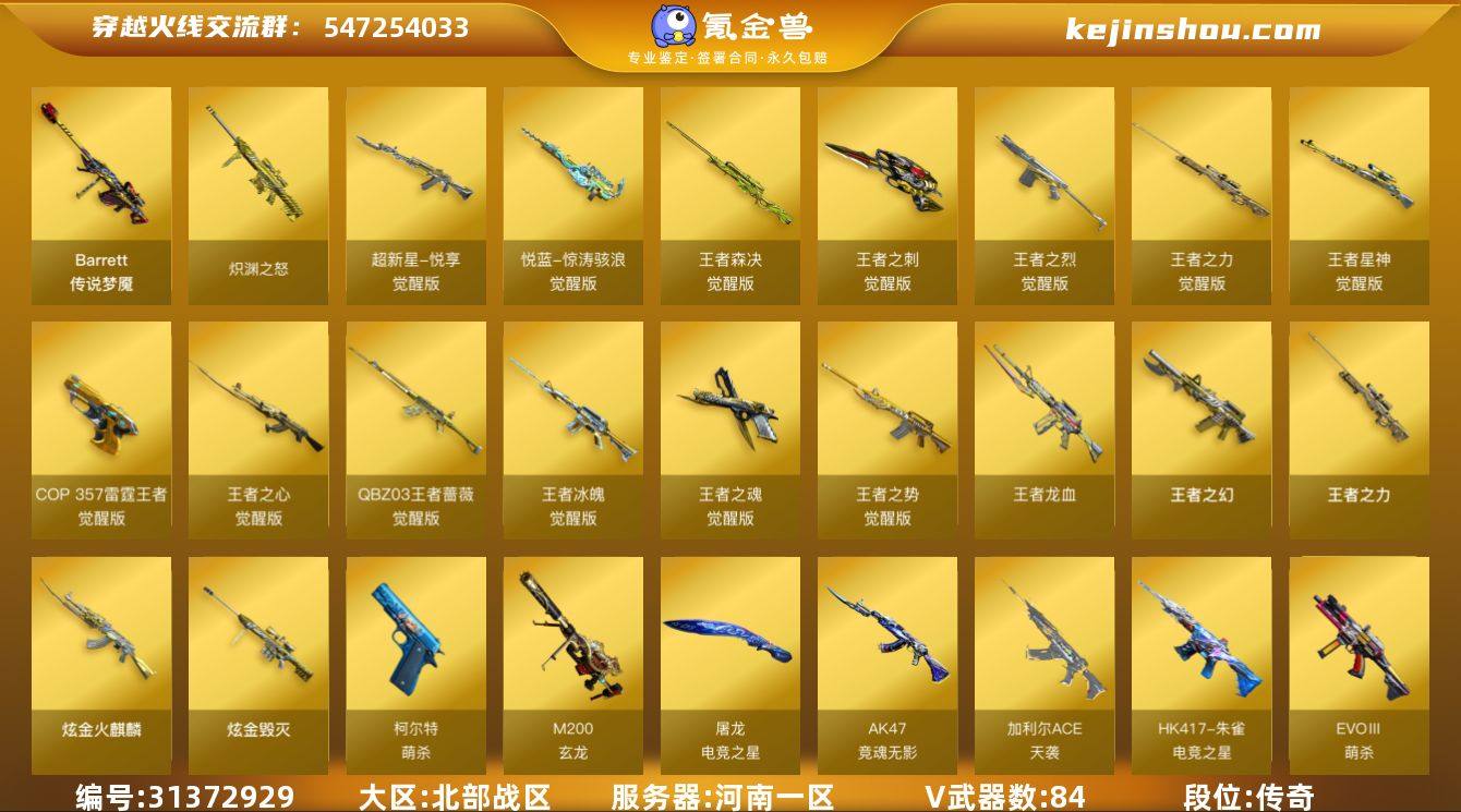 段位:传奇 VIP等级:VIP6 V武器数:84 王者武器数:17 炫金武器数:3 传说梦魇 炽渊之怒,超新星-悦享-觉醒版,悦蓝-惊涛骇浪-觉醒版,王者森决-觉醒版,王者之刺-觉醒版,王者之烈-觉醒版,王者之力-觉醒版,王者星神-觉醒版,COP 357-雷霆王者-觉醒版,王者之心-觉醒版,QBZ-03-王者蔷薇-觉醒版,王者冰魄-觉醒版,王者之魂-觉醒版,王者之势-觉醒版,王者龙血,王者之幻,王者之力 炫金火麒麟,炫金毁灭 AK47-竞魂无影,EVOⅢ-萌杀,G36C-序章,HK417-朱雀-电竞之星,加利尔ACE-天袭,柯尔特-萌杀,M200-玄龙,神威天绫,屠龙-电竞之星,FAMAS G2-天戎,M4A1-赤狱骑士,QBZ191-银翼,无影-神兵利器,AK47-B-身先士卒,尼泊尔-电竞装甲,USP-小动物,COP-堕天神,Glock18-武圣,AK47-黑武士-锦绣游龙,VSK-94-金蚀,AK47-火麒麟,AK47-无影,AK47-雷暴,AK47-黑武士,AK47-机械迷城,M4A1-雷神,黑骑士-海王,M4A1-黑骑士,M4A1-死神,M4A1-黑龙,M4A1-武圣,M4A1-猎神,M4A1-玫瑰精灵,白虎-电玩蓝兔,M200-幻神,Barrett-毁灭,Barrett-极光,Barrett-电竞装甲,蔷薇大炮,AWM-天龙,Kar98k-星神,AA-12-雷霆,AK12-天启,HK417-朱雀,QBZ03-金色蔷薇,Scar Light-白虎,9A91-烈火,屠龙,龙啸,麒麟刺,擎天,炽芒蝶刃,M200-竞技荣光,柯尔特-竞技荣光,USP-雷暴,擎天-竞技荣光,AK47-B-常胜将军,Barrett-暗月传说,柯尔特-电竞装甲,斩神刀-雷暴,AK47-B-战士,AK47-B-战神,AK-47-猩红传说,裁决,天神,G36C-幻影,龙啸-烈火龙威 王者-葵-貂蝉,王者葵-惊若翩鸿,王者凌霄 神威莲华,春,炽天使,电竞教官-云悠悠,机械姬,灵动武士,零,魅影,沙漠玫瑰,王者春,樱,樱-缤纷夏日,鹰,职业选手 HK417-朱雀-电竞之星-竞星跃动音效卡,屠龙-电竞之星-竞星跃动音效卡,天罚音效卡,M4A1-黑骑士音效卡,Barrett-毁灭音效卡,M4A1-雷神音效卡,AK47-火麒麟音效卡