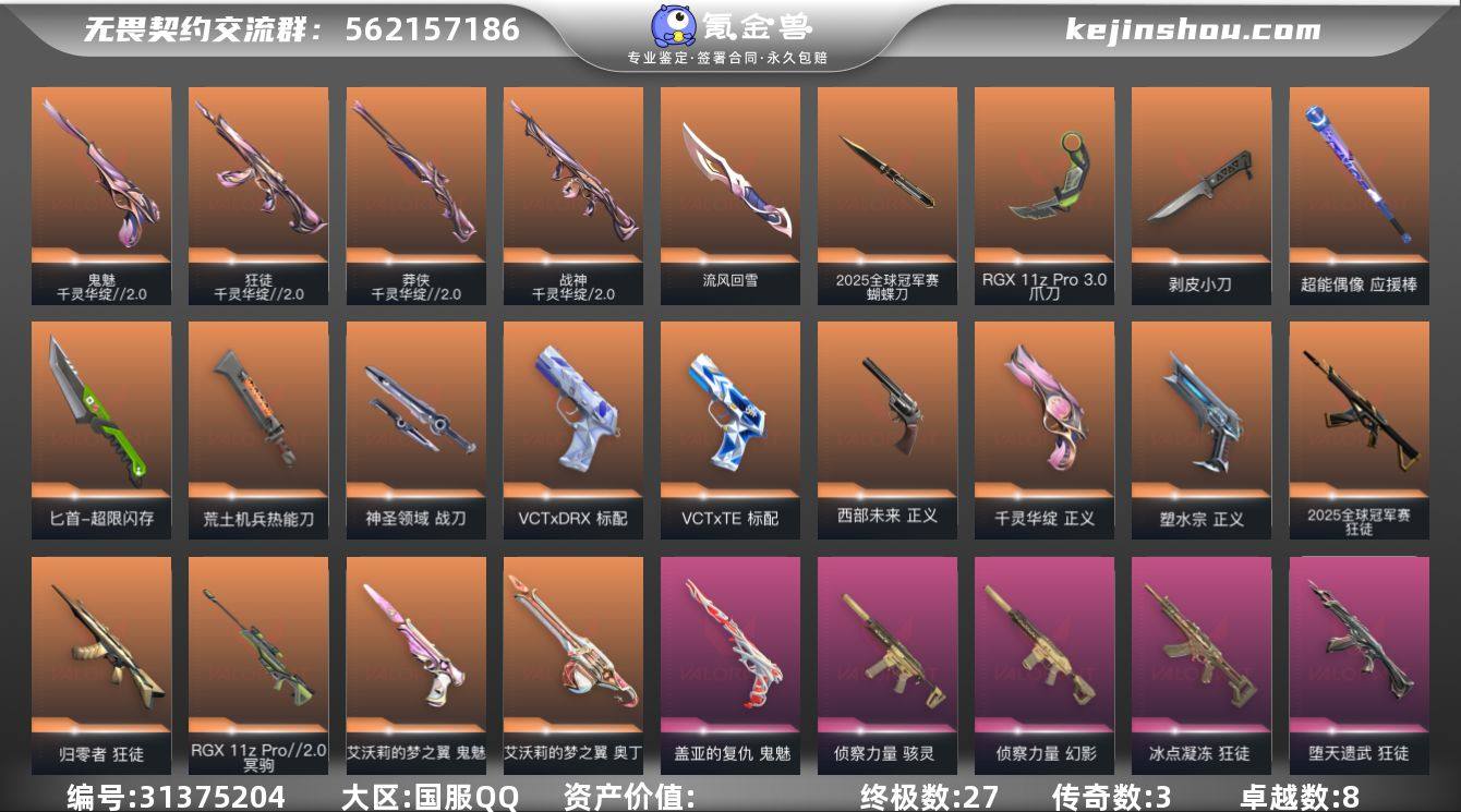 【DSW207】【套装】:2025全球冠军赛套装,千灵华绽//2.0套装,星航勇进 【英雄】:幻棱,炼狱,维斯,暮蝶,钛狐,壹决,铁臂,捷风,雷兹,幽影,不死鸟,贤者,猎枭,蝰蛇,零,芮娜,奇乐,尚勃勒,霓虹,斯凯,夜露,星礈,K/O,海神,盖可,黑梦,钢锁 【近战武器】:近战武器-2025全球冠军赛 蝴蝶刀,近战武器-流风回雪,近战武器-剥皮小刀,近战武器-RGX 11z Pro//3.0 爪刀,近战武器-超能偶像 应援棒,近战武器-超限闪存 匕首,近战武器-荒土机兵 热能刀,近战武器-神圣领域 战刀 【狂徒】:狂徒-2025全球冠军赛,狂徒-归零者,狂徒-千灵华绽//2.0,狂徒-冰点凝冻,狂徒-堕天遗武,狂徒-海洋之星,狂徒-超能偶像,狂徒-荒土机兵,狂徒-星航勇进 【幻影】:幻影-侦察力量,幻影-超限闪存,幻影-神圣领域,幻影-聚合之力,幻影-纳米打击 【戍卫】:戍卫-超能偶像,戍卫-浮光跃金,戍卫-逆冲蛮牛,戍卫-月球哨兵 【獠犬】:獠犬-神圣领域,獠犬-采蜜小蜂队,獠犬-模拟赫兹,獠犬-逆冲蛮牛,獠犬-星航勇进 【冥驹】:冥驹-RGX 11z Pro//2.0,冥驹-冰点凝冻,冥驹-荒土机兵,冥驹-晶态集成,冥驹-模拟赫兹,冥驹-星航勇进,冥驹-星云暗涌 【飞将】:飞将-聚合之力 【莽侠】:莽侠-千灵华绽//2.0,莽侠-超限闪存,莽侠-月球哨兵 【战神】:战神-千灵华绽//2.0,战神-神圣领域,战神-采蜜小蜂队,战神-浮光跃金,战神-星航勇进 【奥丁】:奥丁-艾沃莉的梦之翼,奥丁-纳米打击 【判官】:判官-超能偶像,判官-采蜜小蜂队,判官-纳米打击x 【雄鹿】:雄鹿-模拟赫兹,雄鹿-逆冲蛮牛,雄鹿-月球哨兵 【骇灵】:骇灵-侦察力量,骇灵-荒土机兵,骇灵-浮光跃金,骇灵-星云暗涌 【蜂刺】:蜂刺-超限闪存,蜂刺-聚合之力,蜂刺-星云暗涌 【标配】:标配-超能偶像,标配-荒土机兵,标配-浮光跃金 【VCT手枪】:标配-VCT x...