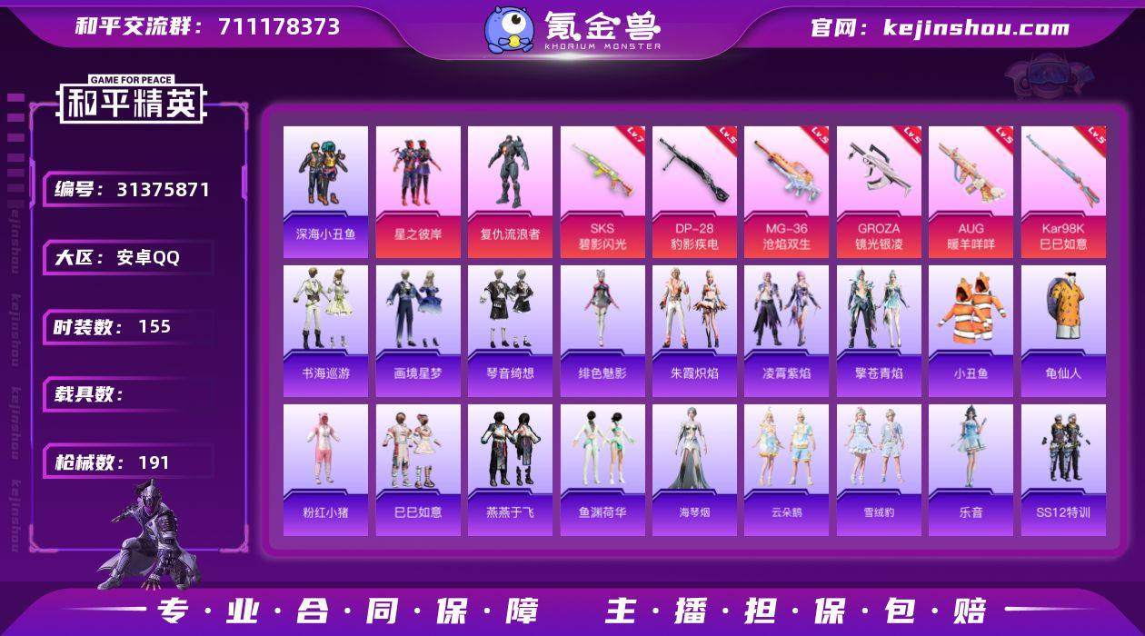 安卓 手Q-2粉装-7特效枪-0载具-1粉色飞行器-57533热力值-12王牌印记-155套装-191枪皮 【热门品类】:套装-深海小丑鱼,套装-小丑鱼,套装-龟仙人,套装-粉红小猪 【粉色套装】:粉装-星之彼岸,角色-复仇流浪者 【粉色枪皮等级】:GROZA-镜光银凌(五级),AUG-暖羊咩咩(五级),AKS-74U-森灵之息(五级),Kar98K-巳巳如意(五级),SKS-碧影闪光(七级),DP-28-豹影疾电(五级),MG-36-沧焰双生(五级) 【粉色枪皮】:GROZA-镜光银凌,AUG-暖羊咩咩,AKS-74U-森灵之息,Kar98K-巳巳如意,SKS-碧影闪光,DP-28-豹影疾电,MG-36-沧焰双生 【粉色降落伞】:暗星紫秘降落伞,碧影闪光降落伞,炫光之旅降落伞,精灵梦叶罗丽降落伞,荧海星豚降落伞,绯穹魔姬降落伞,无垠阁降落伞,炫彩糖果降落伞,暮色玫影降落伞 【稀有套装】:套装-龟仙人,套装-巳巳如意,套装-雪国风尚,套装-炫彩糖果,套装-燕燕于飞,套装-鱼渊荷华,角色-海琴烟,套装-云朵鹅,套装-雪绒豹,角色-乐音,套装-朱霞炽焰,套装-凌霄紫焰,套装-擎苍青焰,角色-绯色魅影,套装-书海巡游,套装-画境星梦,套装-琴音绮想 【稀有枪皮】:AUG-冰晶雪宝,AKM-彩虹符号,AKM-星之彼岸,AKM-破晓战魂,AKM-虎虎生威,AKM-龙的传人,M16A4-幻世战舞者,M16A4-甜心亚梦,M16A4-红色方程式,M16A4-蓝色火焰,SCAR-L-夜灯,SCAR-L-炫彩节奏,SCAR-L-玉兔迎春,SCAR-L-碧影闪光,SCAR-L-红色方程式,SCAR-L-冷漠罗丽,M416-夜灯,M416-糯团青竹,M416-红色方程式,M416-蓝色火焰,GROZA-异彩先驱,GROZA-彩虹符号,AUG-天降萌叽,AUG-耀粉歌者,QBZ-彩虹符号,QBZ-飞驰魅影,M762-天降萌叽,M762-彩虹符号,M762-云朵鹅,M762-登顶巅峰,G36C-星穹咏叹调,AC-VAL-天降萌叽,AC-VAL-甜心亚梦,蜜獾-天降萌叽,ACE32-画境星梦,ARX-凌霄紫焰,UZI-啾咪啾咪,UZI-天降萌叽...