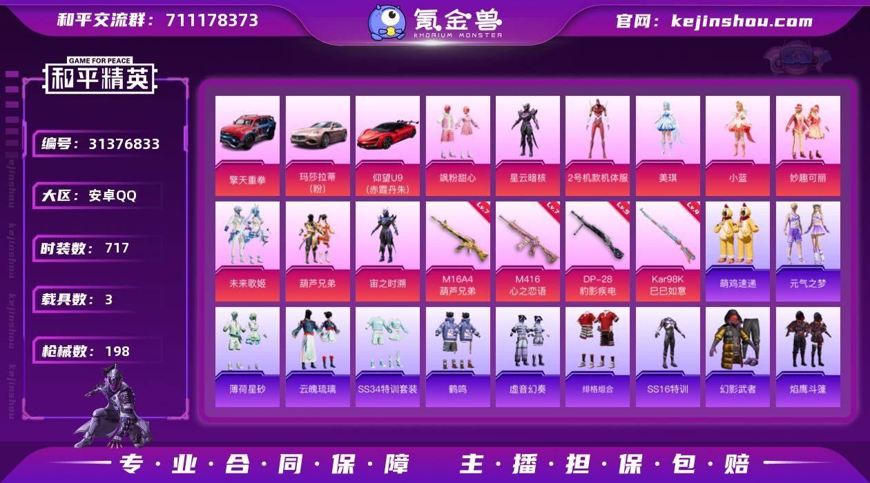热力值:77162 载具数:3 时装数:717 枪械数:198 战备数:177 游戏等级:69 卓越印记:0 传奇印记:0 绝世印记:0 2号机款机体服,葫芦兄弟,美琪,妙趣可丽,飒粉甜心,未来歌姬,小蓝,星云暗核,宙之时溯 七级M16A4-葫芦兄弟,七级M416-心之恋语,五级DP-28-豹影疾电,四级Kar98K-巳巳如意 玛莎拉蒂Ghibli(粉),擎天重拳,仰望U9(赤霞丹朱) 异瞳寒姬降落伞,繁龙极客飞行器,机甲封神飞行器,暗夜鎏金降落伞,垂柳戏鸭降落伞,风花雪月降落伞,绯穹魔姬降落伞,环太平洋降落伞,海渊国主降落伞,精灵梦叶罗丽降落伞,蓝莓炮弹降落伞,烈焰拳霸降落伞,蜜语绒猫降落伞,甜心娃娃降落伞,万古烈焰降落伞,未来歌姬降落伞,王牌四分卫降落伞,闲梦青缨降落伞,旋转彩虹降落伞,焰龙焚天降落伞 萌鸡速递,元气之梦,薄荷星砂,云魄琉璃,SS34特训套装,艾克斯奥特曼,暗夜魅影,暴风机械师,北国孤狼,白光莹,滨海厨神,白糯汤圆,白色伏地魔,半糖蓝莓,岑岑玉浪,长空猛禽,潮流游乐家,传奇侦探,创世·幻影,纯真浪花,迪迦奥特曼,都市魅力,电音精灵,飞驰魅影,绯格组合,疯狂小兔子,福星高照,格斗先锋,怪笑疯兔,龟仙人,刚毅裁决者,光之冒险,海滨突袭者,海岛探路者,鹤鸣,鹤发童颜,虎虎生威吉莉,湖蓝色名流,黑色伏地魔,黄色伏地魔,黄色名流,海上生明月,黄色运动,红色运动,幻世战舞者,火舞潮人,幻羽潜行,幻影武者,海洋之心,捷德奥特曼,极地朋克,军刀雅典娜,酒红色名流,惊鸿侠骨,橘黑制服,娇憨猪猪,竞技达人朋克,竞技名士,竞技勇士朋克,吉莉礼服,极速红龙,街头潮人,街舞之王,锦衣飞扬,金耀舞者,空岛之星,狂沙舞者,空投萌叽,蓝彩潮人,凛冬战士,猎鹰,零款战斗服,六六大吉,蓝色运动,冷焰舞者,猛禽,萌黄之夏,魅力单车,果汁能量,麻辣教官,懵萌河马,萌趣咩咩,萌趣颜团子,明日香款战斗服,卖崽青蛙,逆风勇士,霓虹街区,柠萌假日,牛气冲天,牛气满满,欧布奥特曼,破蛋小黄鸡,破晓战魂,青春冒险家,青春校园,轻风白浪,绮丽涂鸦,青年教官,青涩时光,青玉碎影,瑞龙福将,软萌银虎,荣耀,热情海星,人气偶像,热血青春,熔岩使者,圣诞大吉,时空追击者,赛罗奥特曼,深蓝色名流,神气柴柴,SS12特训,SS13特训,SS14特训,SS15特训,SS16特训,SS17特训,SS18特训,SS19特训,SS20特训,SS21特训,SS22特训,SS23特训,SS24特训,SS25特训,SS26特训,SS27特训,SS28特训,SS2特训,SS30特训套装,SS31特训套装,SS32特训套装,SS33特训套装,SS3特训,SS5特训,SS6特训,SS7特训,SS8特训,SS9特训,巳巳如意,闪银刀客,探宝勇士,甜蜜告白,甜蜜熊情侣,甜梦熊熊,豚鼠丹丹,特训学院,甜心亚梦,团圆交子,听雨铃兰,田园牧歌,特种颜团子,特战装甲,完美偶像,王牌教练,炫蓝之夏,星梦畅游,夏日音浪,雪山精英,醒狮腾龙,雪山征服者,虚音幻奏,夏雨游龙,原初圣火,跃动心情,耀粉歌者,荧惑魅影,音速流光,玉兔迎春,英勇保护者,焰鹰斗篷,幽夜迷踪,夜莺强袭者,战地督导,战地菁英,灼焰舞者 SLR-霓彩脉冲,破片手榴弹-拽到爆炸,AKM-涂鸦街区,Mini14-鸡智如我,P90-玩趣呆呆,AA12-G-纯真浪花,AC-VAL-冠军兔兔,AC-VAL-天降萌叽,AC-VAL-甜心亚梦,AC-VAL-闲梦青缨,AKM-彩虹符号,AKM-虎虎生威,AKM-环太平洋,AKM-萌趣颜团子,AKM-霓虹街区,AKM-破晓战魂,