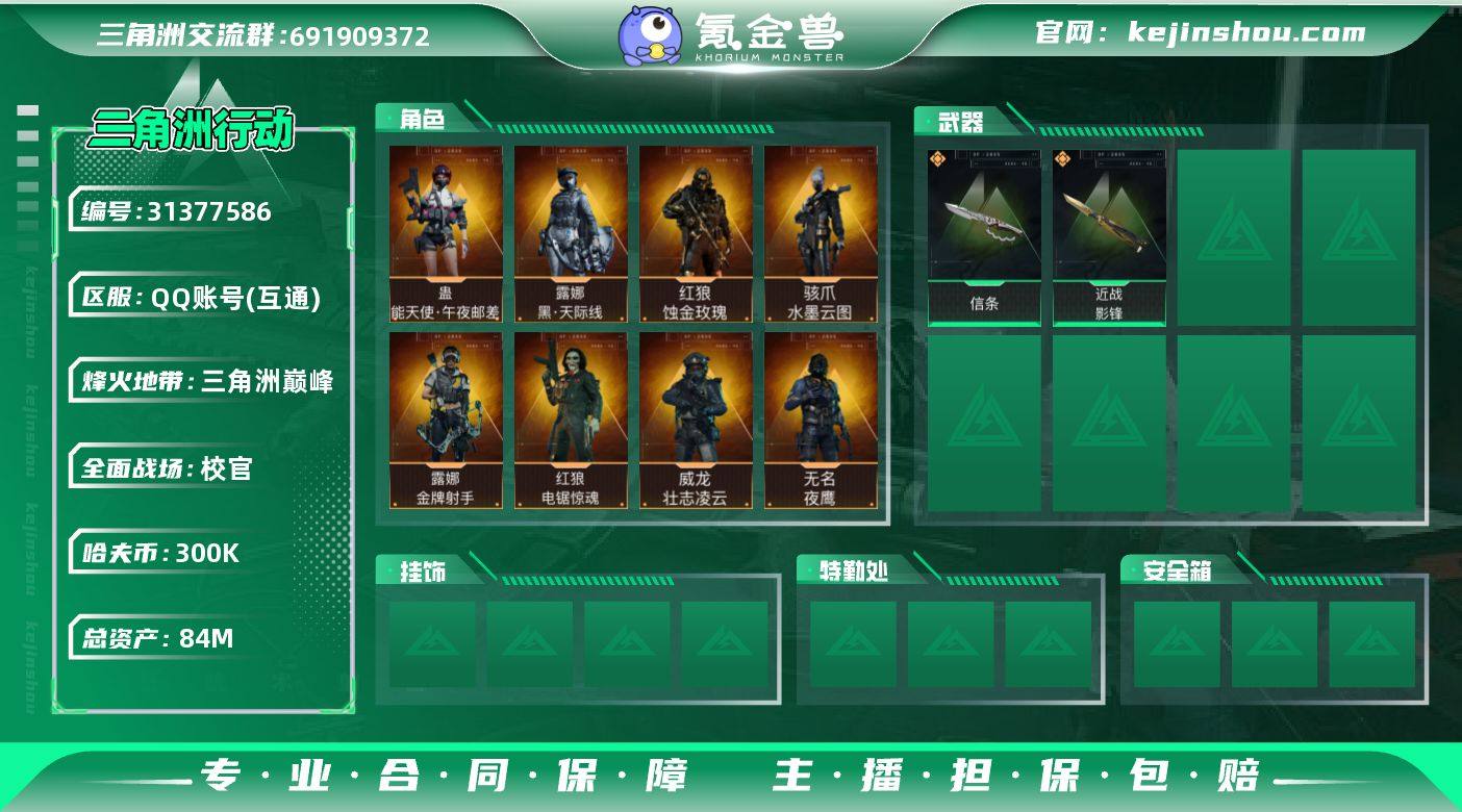 实名:可二次实名 总资产:84M 哈夫币:300K 烽火地带段位:三角洲巅峰 烽火地带等级:60 全面战场段位:校官