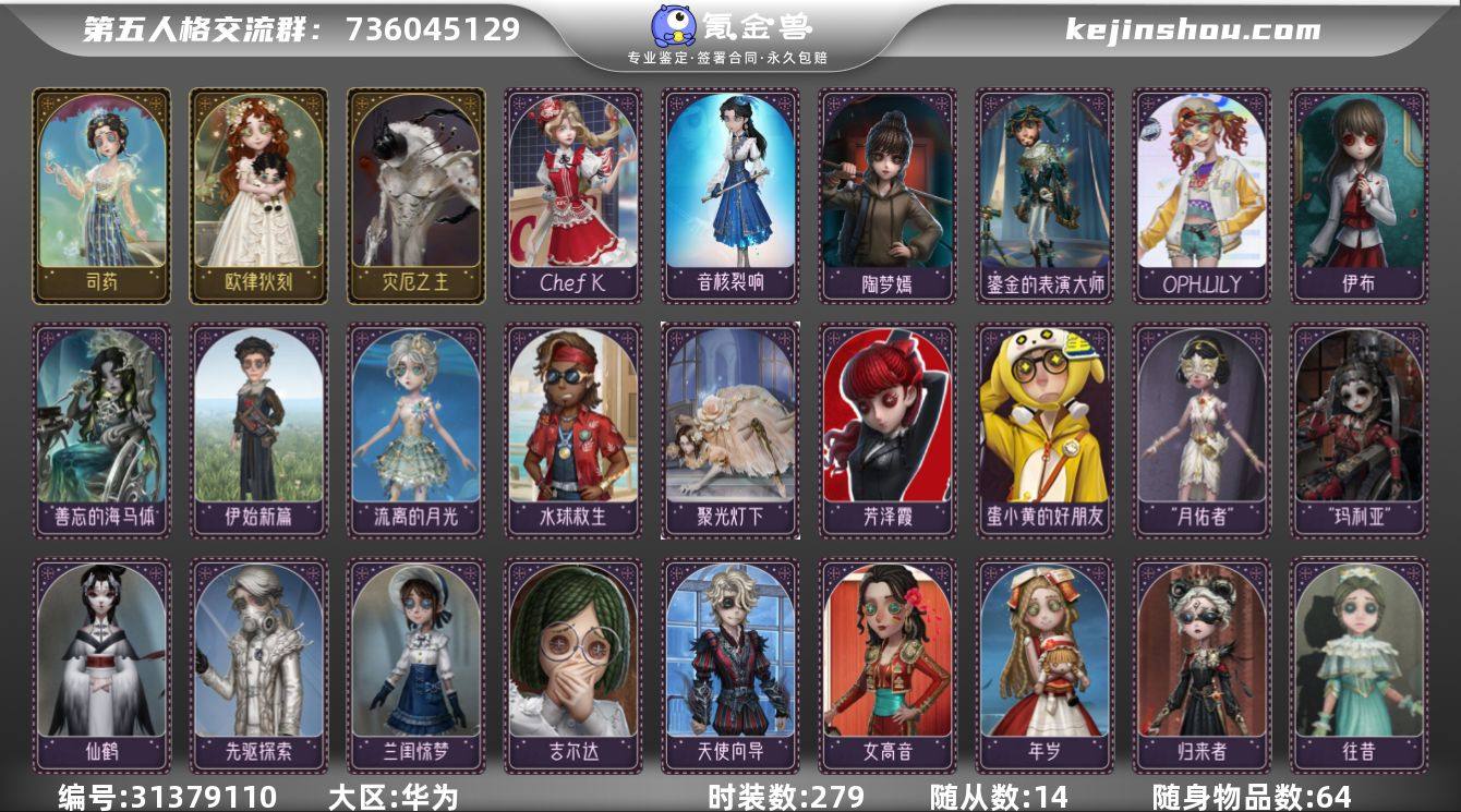 时装数:279 随从数:14 随身物品数:64 医生-司药,“小女孩”-欧律狄刻,黄衣之主-灾厄之主 卖家说:紫薯有11000多,窥镜有300多