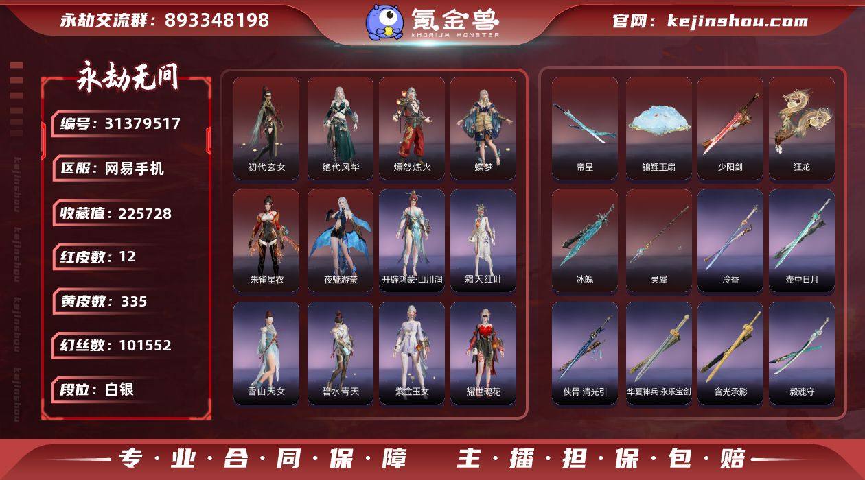 10红256金/少阳剑/冰魄/灵犀/狂龙/夜魅游莹/朱雀星衣/熛怒炼火/蝶梦/绝代风华/初代玄女/龙之道·自知/龙之影·过江龙/西行劫·三尖两刃刀【10.31可换绑】红皮数: 10黄皮数: 256等级: 317幻丝数: 21109英雄外观数量: 0武器外观数量: 0征神通行证等级: 1段位: 黄金收藏值: 179780是否绑定手游: 未绑定手游账号信息: 黄金,未绑定手游,征神通行证未解锁,通行证未升级,初代玄女,朱雀星衣,熛怒炼火,蝶梦,绝代风华,夜魅游莹,龙之道·自知,耀世魂花,紫金玉女,霜天红叶,雪山天女,碧水青天,九阴圣女,西行劫·紫衣仙子,絮云衣,若水尊者,觉之一念,净金宝相,新倩女幽魂·流纨裙,智绘·萍之缘,沐昭,新倩女幽魂·瑶光沐月,苍狼之主,狂猎,孽炎祸斗,闻道,逆水寒·江海沧澜,清雅少女,阴阳姬,天钿女命,御宅花织,贵胄少女,妖刀姬,决战平安京·御神之刃,掌珠仙子,巨鲸客,探海裙,怒浪,华夏宝甲·汉光,复制体·尼尔,常胜袍,龙之影·过江龙,守誓者,骁骑,金沙·梦蜀,司天命,幽篁山鬼,藏雨阁主,赤丹朱湛,姑射真人,击浪,金羽圣鹰,花无痕,浣烟纱,璨银魔枭,瀚海苍鹰,观山