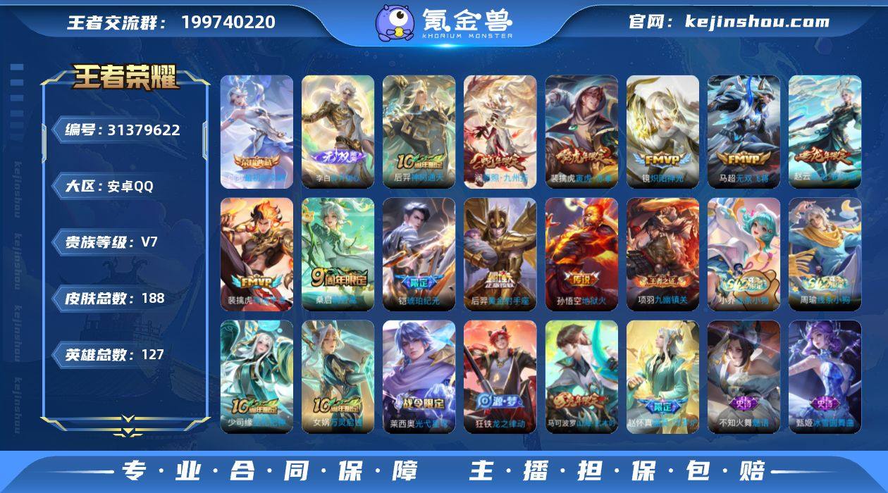 CHC90974 7按键 安卓Q-V7-最强王者段位-127英雄-188皮肤-1典藏皮肤-1无双-11传说-52史诗 【英雄全皮】:孙权全皮,蒙恬全皮 【荣耀典藏】:伽罗最初的交响 【无双皮肤】:李白碎月剑心 【传说皮肤】:后羿神树通天,澜愿照九州拓,裴擒虎祥瑞亨通,桑启鸣野蒿,赵云乘龙铭钟鼎,铠琥珀纪元,马超无双飞将,裴擒虎寅虎赤拳,镜炽阳神光,后羿黄金射手座,孙悟空地狱火 【限定皮肤】:蒙犽顽岩魄,姜子牙天穹之誓,狄仁杰阴阳师,赵云皇家上将,孙尚香蔷薇恋人,元歌无心,马可波罗山海玄木吟,狄仁杰魔术师,达摩沙漠行僧,项羽海滩派对,李元芳云中旅人,鬼谷子五谷丰年,百里玄策原初追逐者,沈梦溪大漠名商,裴擒虎李小龙,裴擒虎寅虎赤拳,裴擒虎擒涛扼浪,鲁班大师探海日志,桑启海盐诗旅,阿古朵江河有灵,张良古海寻踪,蒙恬荣光圣徽,鬼谷子天穹祈灯,李白碎月剑心,伽罗琥珀纪元,铠琥珀纪元,赵云乘龙铭钟鼎,沈梦溪龙舞盛年,刘邦剑破天穹,程咬金群星魔术团,镜青焰无极,项羽苍威无极,周瑜熔金海岸 【年限皮肤】:裴擒虎寅虎赤拳,马可波罗山海玄木吟,赵云乘龙铭钟鼎,澜愿照九州拓 【赛季限定】:达摩沙漠行僧,沈梦溪大漠名商,李元芳云中旅人,桑启海盐诗旅,裴擒虎擒涛扼浪,鲁班大师探海日志,张良古海寻踪,鬼谷子天穹祈灯,刘邦剑破天穹,姜子牙天穹之誓,东皇太一噬灭天穹,太乙真人谧流熔炉,钟馗虚灵犬护,甄姬逆浪荇歌,亚瑟荣光之誓,百里玄策原初追逐者,蒙恬荣光圣徽,牛魔星界战将,项羽九幽镇关 【战令限定】:镜青焰无极,项羽苍威无极,莱西奥光弋星穹,明世隐往忆晖光,周瑜线条小狗,小乔线条小狗 【史诗皮肤】:露娜紫霞仙子,赵云皇家上将,赵云未来纪元,貂蝉圣诞恋歌,甄姬冰雪圆舞曲,狄仁杰魔术师,廉颇地狱岩魂,宫本武藏鬼剑武藏,孙尚香蔷薇恋人,孙尚香水果甜心,嬴...