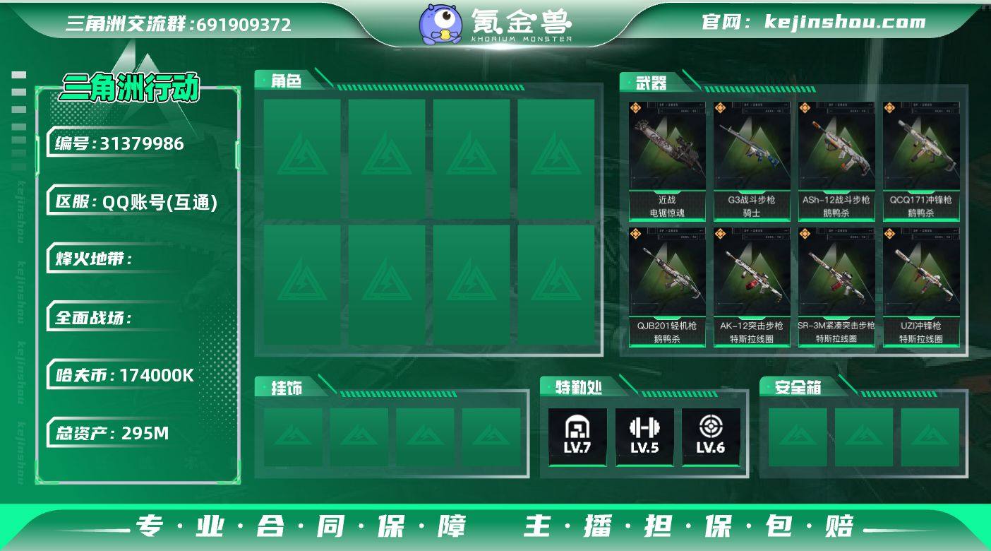 【高额资产号359M.单刀皮暗星.满足烽火/全面战场所有需求.强烈推荐】【Q区三端互通】【无二次】YXz8869-特勤处:仓库9级/靶场4级/训练中心4级-总资产360m-哈夫币9713w-烽火等级:60级 【干员外观】:露娜-金牌射手,乌鲁鲁-荒原猎手 【近战皮肤】:近战-暗星,近战-处刑者1级,近战-黑鹰 【传说外观】:AKM突击步枪-锦绣,K416突击步枪-行动记录,M7战斗步枪-零度协议,SG552突击步枪-运动员,SCAR-H战斗步枪-荼蘼,K437突击步枪-锦绣,MK47突击步枪-暗星,SMG-45冲锋枪-锦绣,SR-3M紧凑突击步枪-暗星,SR-3M紧凑突击步枪-荼蘼,PKM通用机枪-荼蘼,M14射手步枪-蛮荒,M14射手步枪-缄花,SR-25射手步枪-缄花,.357左轮-缄花 【史诗外观】:K416突击步枪-冬日风情,K416突击步枪-腊梅,M7战斗步枪-百步穿杨,SG552突击步枪-哈夫克警备,G3战斗步枪-流沙送葬,AS Val突击步枪-百步穿杨,腾龙突击步枪-猎鳄行动,K437突击步枪-丛影谍踪,MP5冲锋枪-竞技风,Vector冲锋枪-猎鳄行动,Vector冲锋枪-百步穿杨,Vector冲锋枪-异域战争,SMG-45冲锋枪-阿萨拉特攻,SR-3M紧凑突击步枪-开工大吉,勇士冲锋枪-丛影谍踪,MP7冲锋枪-六套之力,S12K霰弹枪-曙光,PKM通用机枪-蝮蛇,M249轻机枪-丛影谍踪,M250通用机枪-囚徒,QJB201轻机枪-炽焰,VSS射手步枪-丛影谍踪,M14射手步枪-工业狂潮, M14射手步枪-航天庆典,SV-98狙击步枪-猎鳄行动,M700狙击步枪-竞技风,M700狙击步枪-百步穿杨,M700狙击步枪-哈夫克警备,AWM狙击步枪-流沙送葬 【稀有外观】:UZI冲锋枪-旧梦,M4A1突击步枪-繁盛,AKM突击步枪-精英联盟,AKM突击步枪-肃杀,ASh-12战斗步枪-繁盛,K416突击步枪-一帆风顺,SG552突击步枪-2026,SG552突击步枪-马年新春,SG552突击步枪-贴花艺术, AK-12突击步枪-马年新春,SCAR-H战斗步枪-荣耀列队,G3战斗步枪-主宰,G3...
