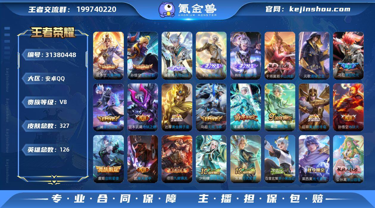 安卓Q-V8-永恒钻石III段位-126英雄-327皮肤-2典藏皮肤-3无双-13传说-85史诗 【英雄全皮】:元歌全皮,孙权全皮,钟馗全皮,狂铁全皮,影全皮 【荣耀典藏】:孙悟空全息碎影,花木兰九霄神辉 【无双皮肤】:李白碎月剑心,韩信群星魔术团,诸葛亮天机白泽 【传说皮肤】:干将莫邪千山共赴,元歌诡秘之主,桑启鸣野蒿,马超琥珀纪元,澜逐花归海,马超无双飞将,诸葛亮时雨天司,铠绛天战甲,虞姬启明星使,达摩黄金狮子座,后羿黄金射手座,宫本武藏地狱之眼,孙悟空地狱火 【限定皮肤】:姜子牙天穹之誓,李白谪仙醉月,狄仁杰阴阳师,赵云皇家上将,孙尚香蔷薇恋人,鲁班七号狮舞东方,庄周高山流水,吕布御风骁将,周瑜赤莲之焰,元歌云间偶戏,元歌无心,夏侯惇朔风刀,马可波罗暗影游猎,狄仁杰魔术师,狄仁杰万华元夜,达摩星际陆战队,达摩沙漠行僧,项羽海滩派对,老夫子醍醐杖,关羽冰锋战神,程咬金演武夺筹,王昭君午后时光,兰陵王驯魔猎人,兰陵王金庭之子,亚瑟潮玩骑士王,孙悟空至尊宝,孙悟空大圣娶亲,牛魔御旌,后羿辉光之辰,李元芳云中旅人,虞姬启明星使,钟馗神迹守卫,钟馗驱傩正仪,杨玉环遇见飞天,雅典娜单词大作战,鬼谷子原初探秘者,诸葛亮时雨天司,苏烈千军破阵,弈星混沌棋,梦奇顽趣,沈梦溪大漠名商,明世隐疑决卦,裴擒虎李小龙,裴擒虎擒涛扼浪,狂铁御狮,狂铁电玩高手,米莱狄御霄,米莱狄胡桃异想国,云中君纤云弄巧,盾山御銮,猪八戒西部大镖客,上官婉儿梁祝,上官婉儿天狼绘梦者,蒙犽狂想玩偶喵,鲁班大师探海日志,桑启海盐诗旅,艾琳流音漫舞,阿古朵江河有灵,张良古海寻踪,高渐离燃音魔法,妲己灵卜魔法,鬼谷子天穹祈灯,李白碎月剑心,马超琥珀纪元,姬小满妄想食味,沈梦溪龙舞盛年,鲁班七号蔬乡物语,李元芳蔬乡物语,刘邦剑破天穹,韩信群星魔术团,项羽...