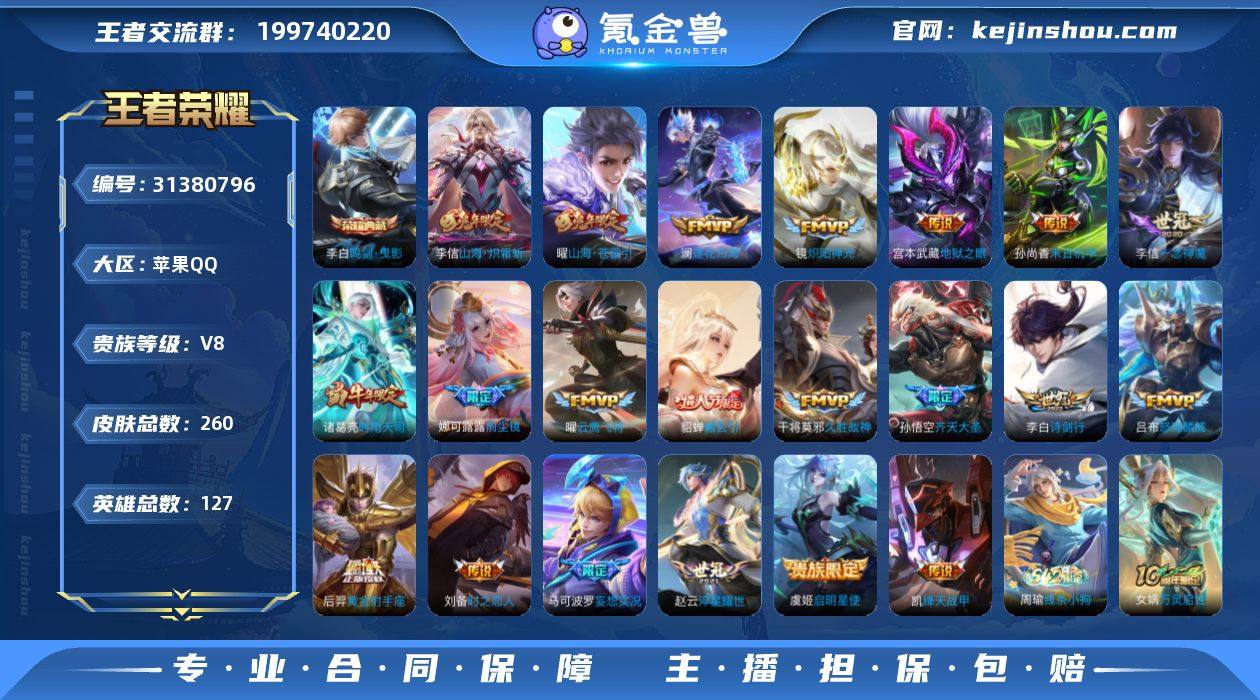 苹果Q-V8-永恒钻石V段位-127英雄-260皮肤-1典藏皮肤-22传说-72史诗 【英雄全皮】:娜可露露全皮,李信全皮,空空儿全皮,海诺全皮 【荣耀典藏】:李白鸣剑曳影 【传说皮肤】:后羿神树通天,貂蝉曦玄引,澜逐花归海,马可波罗妄想实况,孙悟空齐天大圣,曜山海苍雷引,李信山海炽霜斩,吕布怒海麟威,李白诗剑行,娜可露露前尘镜,赵云淬星耀世,诸葛亮时雨天司,铠绛天战甲,镜炽阳神光,虞姬启明星使,曜云鹰飞将,李信一念神魔,刘备时之恋人,干将莫邪久胜战神,后羿黄金射手座,孙尚香末日机甲,宫本武藏地狱之眼 【限定皮肤】:大乔绒语心约,姜子牙天穹之誓,狄仁杰阴阳师,赵云皇家上将,嬴政白昼王子,鲁班七号狮舞东方,高渐离死亡摇滚,元歌无心,典韦蓝屏警告,马可波罗山海玄木吟,马可波罗妄想实况,狄仁杰魔术师,狄仁杰万华元夜,达摩沙漠行僧,项羽海滩派对,程咬金演武夺筹,韩信飞衡,兰陵王金庭之子,娜可露露前尘镜,孙悟空至尊宝,孙悟空大圣娶亲,孙悟空孙行者,孙悟空齐天大圣,李元芳云中旅人,虞姬启明星使,钟馗驱傩正仪,太乙真人华丽摇滚,鬼谷子原初探秘者,鬼谷子五谷丰年,诸葛亮时雨天司,苏烈千军破阵,百里玄策原初追逐者,沈梦溪大漠名商,裴擒虎擒涛扼浪,李信山海炽霜斩,上官婉儿梁祝,嫦娥拒霜思,嫦娥暖冬兔眠,曜山海苍雷引,鲁班大师探海日志,桑启海盐诗旅,暃星界游侠,艾琳女武神,艾琳流音漫舞,司空震地狱燃心,阿古朵江河有灵,张良古海寻踪,蒙恬荣光圣徽,高渐离燃音魔法,妲己灵卜魔法,鬼谷子天穹祈灯,伽罗琥珀纪元,姬小满妄想食味,貂蝉曦玄引,沈梦溪龙舞盛年,鲁班七号蔬乡物语,李元芳蔬乡物语,刘邦剑破天穹,程咬金群星魔术团,镜青焰无极,项羽苍威无极,海诺心动手记,刘备异域游侠,芈月浮光幕影,周瑜熔金海岸 【年限皮肤】:韩信飞衡,诸葛亮...