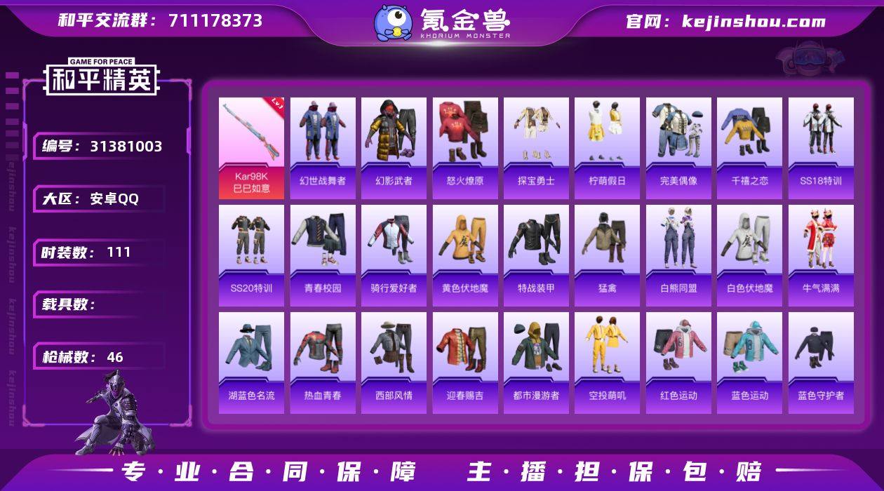 XQ982+【S1赛事全套身法素材号 地铁天赋已开 2特效 三太阳可二次】安卓Q区-2特效枪-12417热力值-1王牌印记-40套装-46枪皮【特效枪等级】:Kar98K-巳巳如意(五级- Kar98K-巳巳如意)【优质武器皮肤】: Kar98K-巳巳如意【稀有武器皮肤】: Kar98K-巳巳如意 蜜獾-乌木金纹 PKM-啾咪啾咪 M416-红色方程式 M416-蓝色火焰 M416-夜灯 AKM-夜灯 AKM-玉龙 AKM-萌趣颜团子 SCAR-L-炫彩节奏 M16A4-红色方程式 M16A4-蓝色火焰 M16A4-幻世战舞者 GROZA-乌木金纹【其他套装】: S1赛事 恋语绒绒 风舞幻音 战术大师 都市漫游者 SS8特训 白熊同盟 青玉碎影 红色运动 蓝色运动 黄色伏地魔 白色伏地魔 热血青春 SS9特训 湖蓝色名流 骑行爱好者 蓝色守护者 猛禽 特战装甲 西部风情 怒火燎原 幻世战舞者 青春校园 牛气满满 迎春赐吉 完美偶像 幻影武者 千禧之恋 萌趣颜团子 SS10特训 特种颜团子 探宝勇士 SS18特训 空投萌叽 SS20特训 SS14特训 柠萌假日