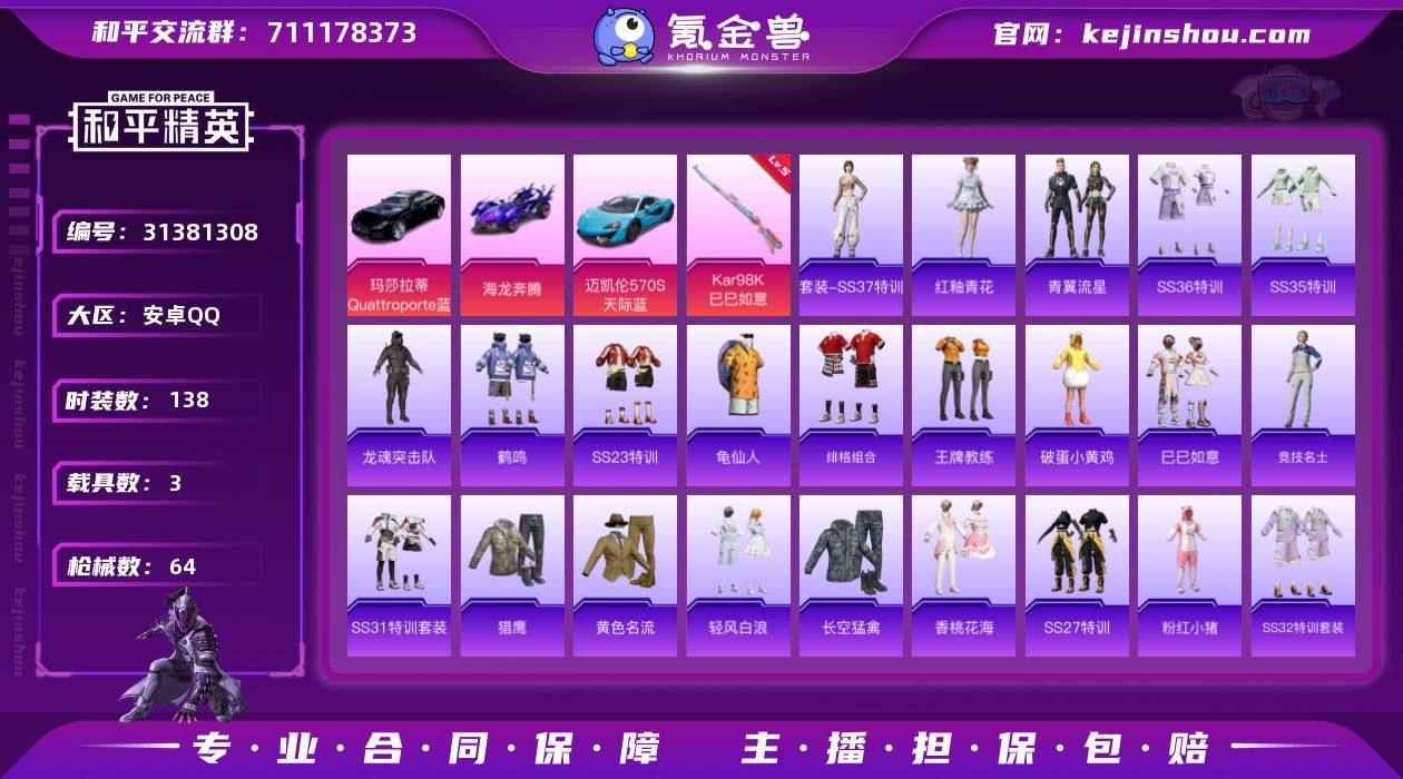 热力值:18728 载具数:3 时装数:138 枪械数:64 战备数:37 游戏等级:52 卓越印记:1 传奇印记:0 绝世印记:0 五级Kar98K-巳巳如意 玛莎拉蒂Quattroporte(夜幕蓝),海龙奔腾,迈凯伦570S(天际蓝) 罪夜之冕降落伞,桃夭倾城飞行器,桃夭倾城降落伞,雪月幻音降落伞 红釉青花,SS37特训,青翼流星,SS36特训,SS35特训,缤纷果语,长空猛禽,创世·幻影,绯格组合,粉红小猪,龟仙人,鹤鸣,黄色名流,竞技名士,空岛之星,龙的传人,龙魂突击队,猎鹰,魅力单车,柠萌假日,破蛋小黄鸡,轻风白浪,青玉碎影,SS23特训,SS24特训,SS25特训,SS26特训,SS27特训,SS30特训套装,SS31特训套装,SS32特训套装,SS33特训套装,巳巳如意,王牌教练,香桃花海,星夜迷魅,战地督导,智谋强哥 AA12-G-雨过天青,AMR-雨过天青,M16A4-雨过天青,PKM-雨过天青,沙漠之鹰-雨过天青,ACE32-冰晶雪宝,PKM-啾咪啾咪,MK12-乌木金纹,铝热弹-炫彩糖果,P90-玩趣呆呆,AC-VAL-天降萌叽,AKM-龙的传人,AKM-破晓战魂,AUG-天降萌叽,AUG-耀粉歌者,DP-28-彩虹符号,M16A4-红色方程式,M16A4-蓝色火焰,M200-乌木金纹,M249-彩虹符号,M24-能量风暴,M416-红色方程式,M416-蓝色火焰,M416-糯团青竹,M762-彩虹符号,M762-天降萌叽,MG3-幻世战舞者,蜜獾-桃夭倾城,Mini14-涂山之恋,Mini14-炫彩节奏,Mini14-香桃花海,MK20-H-星途旅人,P90-巳巳如意,平底锅-田园牧歌,破片手榴弹-巳巳如意,QBZ-彩虹符号,S12K-破晓战魂,S12K-玩趣呆呆,S686-红色方程式,S686-巳巳如意,SCAR-L-红色方程式,SCAR-L-炫彩节奏,SCAR-L-星途旅人,SLR-彩虹符号,UZI-啾咪啾咪,UZI-天降萌叽,Vector-田园牧歌,VSS-香桃花海,野牛-桃夭倾城 雨过天青降落伞,顶峰精英尾迹,空岛之星尾迹,SS30王牌降落伞,星途旅人降落伞 实名:不可二次实名