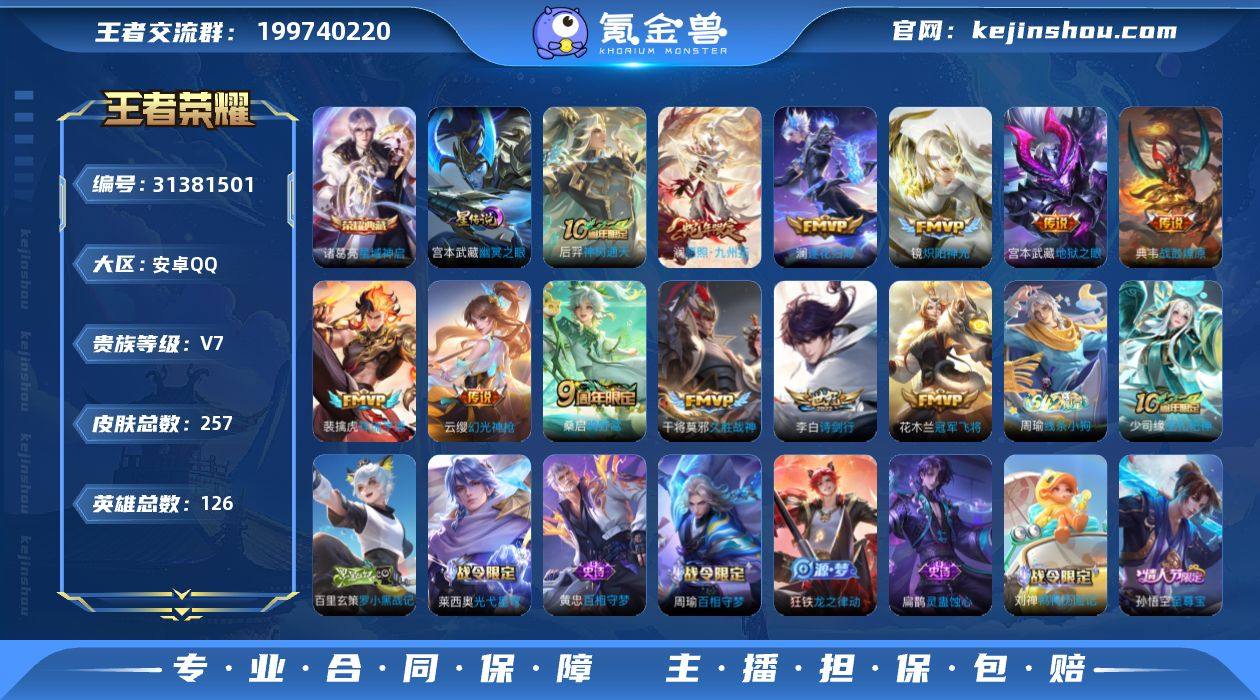 AL673843 【清仓无套路:基础限定+热门皮,视频验号放心拍 】 皮肤数174 传说皮肤数15 史诗皮肤数53 英雄数128 营地id1894170440 贵族等级【文本】贵族7级 【贵族7级】 荣耀典藏1 内测皮肤2 年限皮肤2 限定皮肤62 赛季限定20 史诗皮肤53 战令限定19 勇者皮肤78 其他皮肤27 荣耀典藏:花木兰九霄神辉; 内测皮肤:姬小满妄想食味,孙尚香蔷薇恋人; 年限皮肤:澜愿照九州拓,大乔乘龙忆丹青; 限定皮肤:白起死霸装,姬小满小满鸭,姬小满妄想食味,钟馗虚灵犬护,狂铁龙之律动,太乙真人谧流熔炉,澜愿照九州拓,桑启鸣野蒿,上官婉儿群星魔术团,戈娅驭风魔法,孙尚香蔷薇恋人,西施玲珑珍味,鲁班大师探海日志,扁鹊奇幻香踪,沈梦溪匿光破解者,百里玄策原初追逐者,裴擒虎擒涛扼浪,杨戬潮玩骑兵,夏洛特浮生妄,虞姬无限倾心,暃星界游侠,孙悟空齐天大圣,桑启海盐诗旅,嫦娥暖冬兔眠,梦奇顽趣,元歌无心,狄仁杰神器狴犴令,狄仁杰魔术师,孙悟空孙行者,不知火舞绯月行,钟无艳超时空战士,鬼谷子五谷丰年,甄姬落雪兰心,赵云皇家上将,李元芳云中旅人,雅典娜黎明之约,狂铁电玩高手,王昭君午后时光,沈梦溪大漠名商,兰陵王金庭之子,公孙离玉兔公主,项羽海滩派对,韩信傲雪梅枪,芈月幻夜卜梦,黄忠火炮绅士,狄仁杰阴阳师,达摩沙漠行僧,狄仁杰鹰眼统帅,苏烈千军破阵,孙尚香异界灵契,钟馗驱傩正仪,明世隐疑决卦,妲己灵卜魔法,亚连落雪白狼,刘邦剑破天穹,典韦蓝屏警告,大乔乘龙忆丹青,鬼谷子天穹祈灯,蒙恬荣光圣徽,高渐离燃音魔法,鲁班七号蔬乡物语,李元芳蔬乡物语; 赛季限定:亚瑟荣光之誓,钟馗虚灵犬护,太乙真人谧流熔炉,鲁班大师探海日志,百里玄策原初追逐者,裴擒虎擒涛扼浪,桑启海盐诗旅,梦奇顽趣,李元芳云中旅人,雅典娜黎明之约,沈梦溪大漠名商,兰陵王金庭之子,...