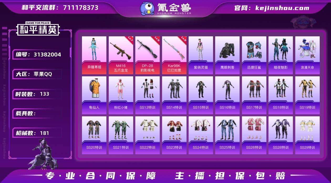 苹果 手Q-1粉装-3特效枪-0载具-2粉色飞行器-51844热力值-8王牌印记-133套装-181枪皮 QW262811 【热门品类】:套装-浪漫天命,套装-龟仙人,套装-粉红小猪 【粉色套装】:角色-异瞳寒姬 【粉色枪皮等级】:M416-五爪金龙(七级),Kar98K-巳巳如意(五级),DP-28-豹影疾电(五级) 【粉色枪皮】:M416-五爪金龙,Kar98K-巳巳如意,DP-28-豹影疾电 【粉色飞行器】:星夜魔法师飞行翼 【粉色降落伞】:香水柠檬降落伞,闪光银龙降落伞,环太平洋降落伞,垂柳戏鸭降落伞,异瞳寒姬降落伞,极意拳锋降落伞,炫彩糖果降落伞 【稀有套装】:套装-龟仙人,套装-雪国风尚,套装-炫彩糖果,角色-紫俏灵猫 【稀有枪皮】:AUG-冰晶雪宝,AKM-夜灯,AKM-彩虹符号,AKM-影袭,AKM-灼热熔岩,AKM-缤纷海域,AKM-萌趣颜团子,AKM-虎虎生威,AKM-霓虹街区,AKM-龙的传人,M16A4-夜灯,M16A4-幻世战舞者,M16A4-甜心亚梦,M16A4-红色方程式,M16A4-蓝色火焰,SCAR-L-炫彩节奏,SCAR-L-玉兔迎春,SCAR-L-红色方程式,SCAR-L-黄金龙骨,M416-暗夜行者,M416-滑板小狐,M416-糯团青竹,M416-红色方程式,M416-蓝色火焰,GROZA-异彩先驱,GROZA-彩虹符号,GROZA-影袭,GROZA-懵萌河马,GROZA-治愈之星,GROZA-田园牧歌,GROZA-黑色刀锋,AUG-天降萌叽,AUG-耀粉歌者,QBZ-彩虹符号,QBZ-电玩视界,QBZ-赛罗,QBZ-飞驰魅影,M762-天降萌叽,M762-彩虹符号,M762-瑞龙福将,M762-绯红前夜,G36C-懵萌河马,G36C-时空追击者,G36C-暗夜玫瑰,AC-VAL-天降萌叽,AC-VAL-甜心亚梦,蜜獾-天降萌叽,蜜獾-娇憨猪猪,UZI-啾咪啾咪,UZI-娇憨猪猪,UZI-幽秘魅影,UZI-影袭,UZI-炫彩节奏,UZI-红色方程式,UMP45-时空追击者,UMP45-涂山之恋,UMP45-生命誓言,UMP45-诡娃娃,Vector-彩虹符号,Vector-治愈之星,Vector-田园牧歌,汤姆逊-天降萌叽,汤姆...