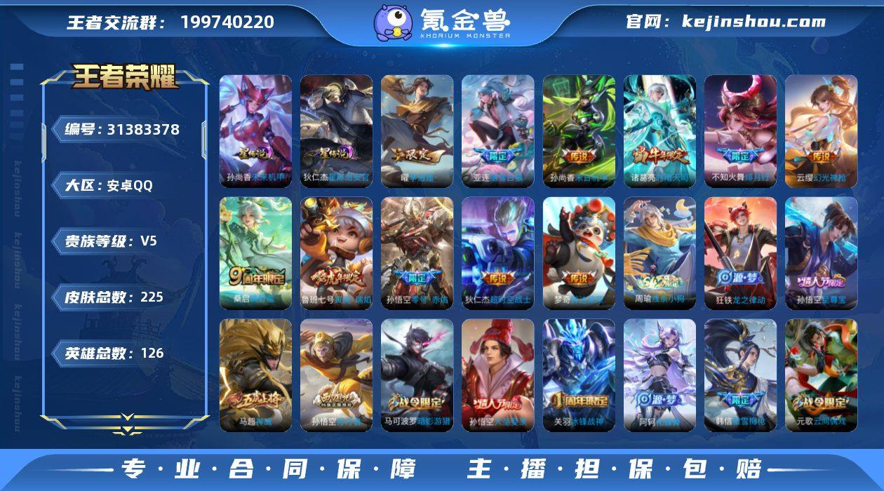 BHC80869,,,,,2星元/安卓Q-V5-永恒钻石IV段位-126英雄-225皮肤-11传说-60史诗 【英雄全皮】:影全皮 【传说皮肤】:云缨幻光神枪,桑启鸣野蒿,亚连落雪白狼,不知火舞绯月行,鲁班七号寅虎瑞焰,曜李逍遥 ,诸葛亮时雨天司,孙悟空零号赤焰,梦奇胖达荣荣,孙尚香末日机甲,狄仁杰超时空战士 【限定皮肤】:白起狰,姜子牙天穹之誓,狄仁杰阴阳师,廉颇寅虎御盾,赵云皇家上将,墨子神迹守卫,嬴政优雅恋人,鲁班七号寅虎瑞焰,庄周高山流水,钟无艳王者之锤,钟无艳超时空战士,芈月重明,芈月幻夜卜梦,吕布御风骁将,元歌云间偶戏,元歌无心,甄姬游园惊梦,甄姬落雪兰心,曹操烛龙,典韦穷奇,马可波罗逐梦之星,马可波罗暗影游猎,狄仁杰魔术师,狄仁杰万华元夜,达摩星际陆战队,达摩沙漠行僧,项羽海滩派对,老夫子醍醐杖,老夫子航海奇遇记,关羽冰锋战神,程咬金演武夺筹,韩信傲雪梅枪,兰陵王金庭之子,不知火舞绯月行,亚瑟潮玩骑士王,孙悟空至尊宝,孙悟空大圣娶亲,孙悟空零号赤焰,孙悟空孙行者,李元芳云中旅人,钟馗驱傩正仪,雅典娜黎明之约,蔡文姬繁星吟游,鬼谷子原初探秘者,鬼谷子五谷丰年,诸葛亮时雨天司,黄忠火炮绅士,苏烈千军破阵,弈星混沌棋,沈梦溪大漠名商,明世隐疑决卦,裴擒虎李小龙,裴擒虎擒涛扼浪,米莱狄胡桃异想国,云中君纤云弄巧,盾山御銮,猪八戒西部大镖客,上官婉儿梁祝,嫦娥拒霜思,曜李逍遥 ,鲁班大师探海日志,桑启海盐诗旅,张良古海寻踪,鬼谷子天穹祈灯,姬小满妄想食味,亚连落雪白狼,沈梦溪龙舞盛年,刘邦剑破天穹 【年限皮肤】:诸葛亮时雨天司,吕布御风骁将,鲁班七号寅虎瑞焰,廉颇寅虎御盾 【赛季限定】:白起狰,曹操烛龙,芈月重明,典韦穷奇,盾山御銮,弈星混沌棋,明世隐疑决卦,老夫子醍醐杖,鬼谷子原初探秘者,狄仁杰万华元夜,程...