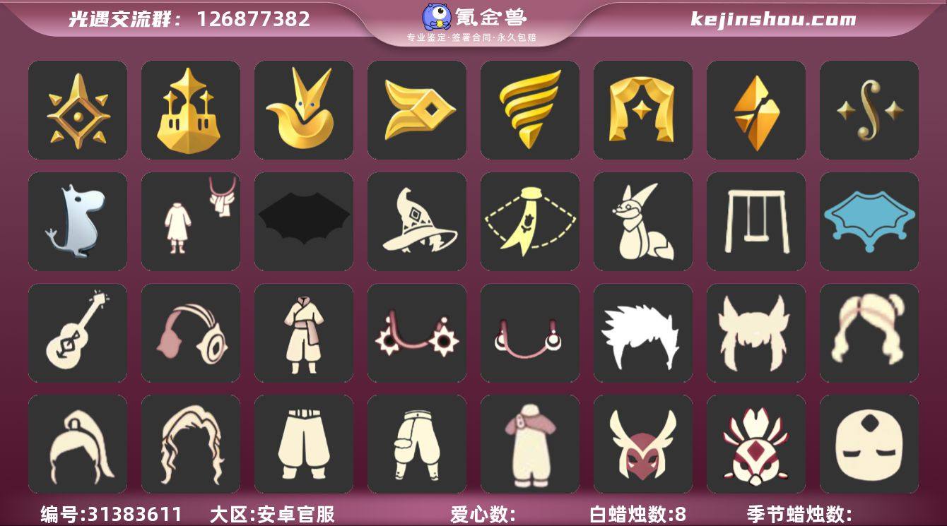 账号类型: 手机账号 季节已毕业: 风行季,潜海季,表演季,破晓季,欧若拉季,夜行季,追忆季,拾光季,归巢季,九色鹿季,筑巢季,二重奏季,姆明季,彩染季,双星季 完成地图: 晨岛,云野,雨林,霞谷,暮土,禁阁 珍稀物品: 羚羊面具(鹿头),白枭 礼包: 蝙蝠套,巫师,围巾,九色鹿角,绊爱,大铁头,鹿角,蜘蛛斗,兔子鞋,秋千,茶桌,瑞雪,福娃,灯笼,鲤鱼套,橘子,贝壳,兔子,南瓜,枯角,雪花,鲤鱼,tgc,猫背饰,星月头饰,彩虹耳钉,海螺,四叶草,爱心眼镜,雪人鞋,线框斗,优雅三件套,姆明饰品套装,史力奇套装,树精肩饰,恶作剧飞行扫帚,爱丽丝围裙套装礼包,衔福献瑞礼包,献瑞折扇礼包,心心相印发饰礼包,小狗周年发饰,青衫落拓礼包,小黄鸭雨衣套装礼包 裤子: 武士裤,背带裤,白棉裤,紧身裤,连体裤,击剑裤,杂技裤 鞋子: 芭蕾鞋,鱼嘴凉靴,皮鞋,人字拖,凉鞋,布鞋,毛靴 面具: 黄鼠狼,红狐狸,虎头,龙头,兔头,玫瑰花面具,鸟嘴胡子面具,羊头面具,右眼竖纹面具,右眼泪痕面具,忧郁脸面具,玫瑰面具 项链: 铃铛,围巾,海龟项链,螃蟹肩饰 发型: 正太,高马尾,樱花,公主,书虫,虚荣,猫耳,白枭 斗篷: 白金,红金,黑金,白鸟斗,紫斗篷,花瓣斗篷,海洋斗,彩虹斗,红绒斗篷,绿芽 配饰: 雨伞,排箫,吉他,笛子,篝火,彩旗,气球,礼炮,坐垫,海螺,大提琴,手持小铃铛,大铃铛乐器,乐器,寻宝铲 亮点: 祥云瑞气服饰,圆菇,爆炸头,平菇,火焰头,斗笠,斜太,失孤,疯帽,兔耳,金鳞耳饰,枫叶斗,萨克斯