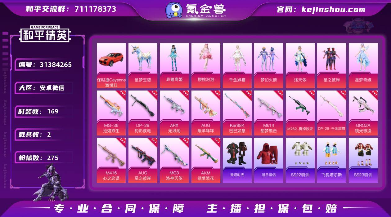 【新年亏本出售!可秒换绑】【17粉装-14粉枪-0载具-4珍稀飞行器-200套装-272枪皮】当前段位:超级王牌7星 历史最高段位:卓越王牌11星 热力值:90811 王牌印记:13 卓越印记:1 游戏等级:62【稀有资产】套装-浪漫天命/套装-暗影哥特/套装-龟仙人/套装-兔兔白日梦/套装-晶辉守护/玩偶服-小狗蛇点点/套装-璀璨流光/玩偶服-懒羊羊/角色-都市丽猫/套装-绒宝小鹅/套装-宝石天鹅/套装-纯白跃动/套装-牛仔情诗/套装-银月精灵/套装-圣穹绘梦/套装-虚空漩涡/角色-灵公主/角色-银尘/角色-冰公主/角色-情公主/角色-鲛海歌灵 【粉色套装】套装-蝶舞迷情/套装-缤纷油彩/套装-俏皮狐尾/角色-洛天依/套装-纯珍童话/套装-镜光幻境/角色-圣堂之誓/角色-小叽联名款/套装-蜜语绒猫/角色-美琪/角色-异瞳寒姬/套装-雪月幻音/套装-幻彩电音/角色-幻海仙踪/套装-星穹咏叹调/角色-冰魄/角色-奇迹舞步 美琪 【粉色枪皮】M16A4-晶梦幻蝶[3级]/SCAR-L-锦绣绵绵[5级]/M416-电玩时刻[5级]/AUG-暖羊咩咩[5级]/Kar98K-圣域龙灵[3级]/Kar98K-巳巳如意[5级]/AMR-智耀战神[5级]/MK12-雪月幻音[3级]/Mk14-甜梦熊击[5级]/汤姆逊-热量炸弹[5级]/AKS-74U-星穹咏叹调[6级]/PKM-江南烟雨[7级]/MG-36-幻彩电音[4级]/M249-猪猪侠[6级] 【飞行器】春暖花开飞行器/祥瑞锦鲤飞行器/终晖之翼飞行器/小叽联名款飞行器[1级]