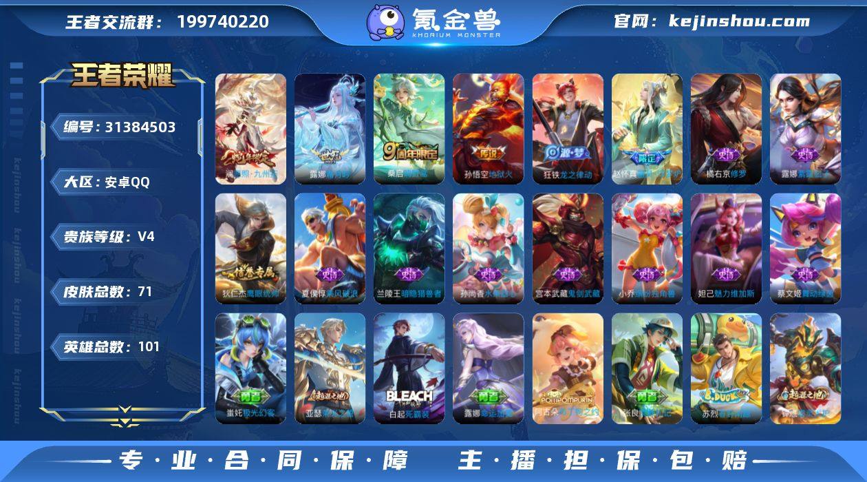实名: 可修改 贵族等级: V4 英雄数: 101 皮肤数: 71 传说皮: 地狱火,霜月吟 限定皮: 鸣野蒿,愿照·九州拓