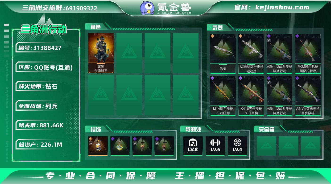 实名:不可二次实名 总资产:226.1M 哈夫币:881.66K 烽火地带段位:钻石 烽火地带等级:60 全面战场段位:列兵 全面战场等级:18 8级仓库,6级训练中心,4级靶场,5级指挥中心,0级潜水中心,3级防具台,3级工作台,3级制药台,3级技术中心,1级收藏室 战术部门等级:3 战斗部门等级:2 医疗部门等级:2 研发部门等级:2 后勤部门等级:1 曼德尔砖-气象感应:0 曼德尔砖-命运王牌:0 曼德尔砖-电玩高手:1 曼德尔砖-美杜莎:0