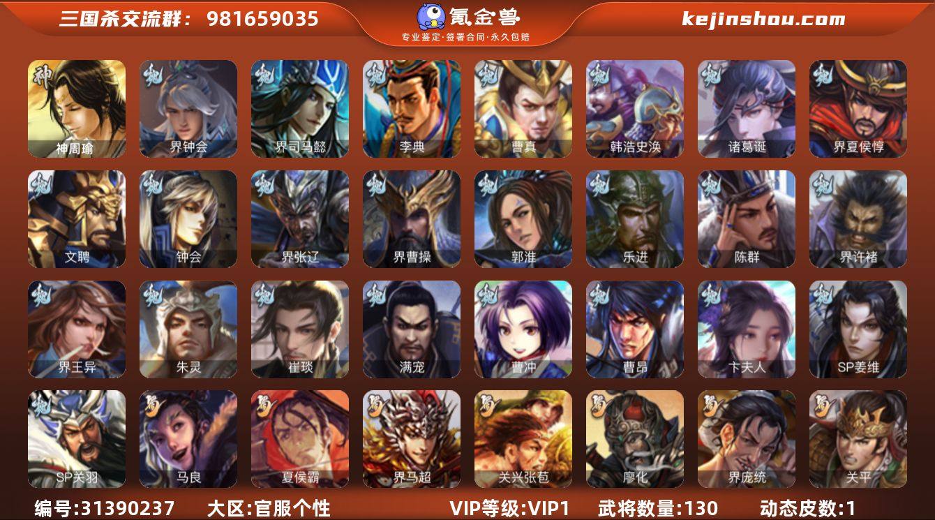 官阶:先锋将军;VIP等级:VIP1;史诗武将数量:2;动态皮肤数量:1;武将总数:130;史诗宝珠数量:0;将魂数量:35;神将:0;魏国史诗武将:0;蜀国史诗武将:0;吴国史诗武将:0;群史诗武将:1 界钟会,界沮授,神周瑜,SP关羽,乐进,曹昂,诸葛诞,朱灵,文聘,SP姜维,钟会,曹冲,郭淮,满宠,界王异,界曹操,界司马懿,界夏侯惇,界张辽,界许褚,李典,曹真,韩浩史涣,陈群,卞夫人,崔琰,SP孙尚香,夏侯霸,马良,关兴张苞,廖化,界马岱,关平,刘封,界刘备,界赵云,界马超,SP徐庶,吴懿,周仓,张松,黄皓,界诸葛亮,界庞统,杨仪,刘巴,诸葛瑾,孙鲁育,程普,虞翻,界甘宁,界黄盖,界周瑜,界大乔,界陆逊,孙鲁班,朱桓,顾雍,界孙权,吕岱,蒋钦,界小乔,伏完,界袁术,伏皇后,李儒,华雄,袁术,界华佗,公孙瓒,蔡夫人,郭图逢纪,界公孙瓒,胡车儿,谋卢植,诸葛亮-龙年限定(动态)