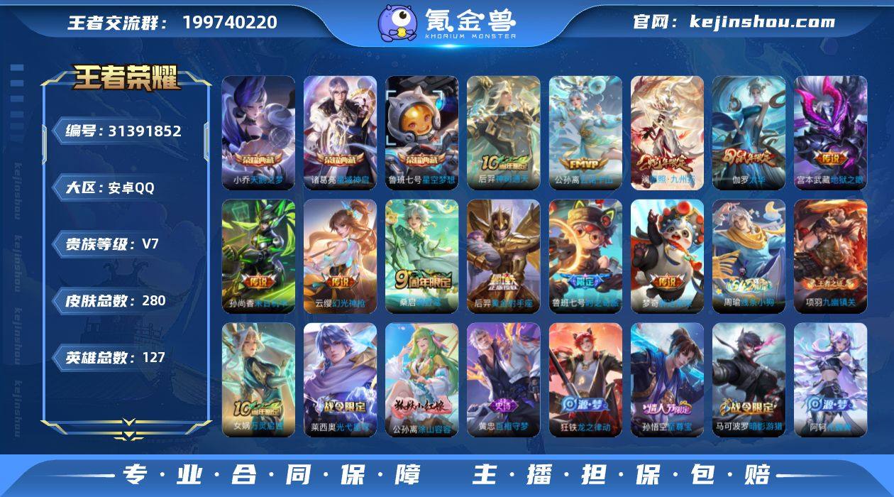 贵族等级:V7 典藏皮肤数:3 珍品无双皮肤数:0 无双皮肤数:0 珍品传说皮肤数:0 传说皮肤数:11 史诗皮肤数:77 皮肤数:280 英雄数:127 段位:星耀 卖家说:带小魔方一万5小国赵云,一万2小国高评分伽罗,一万二金标孙尚香,一万二鲁班,还有个金标后羿差点万战,小龙人银标差点万战,带小魔方