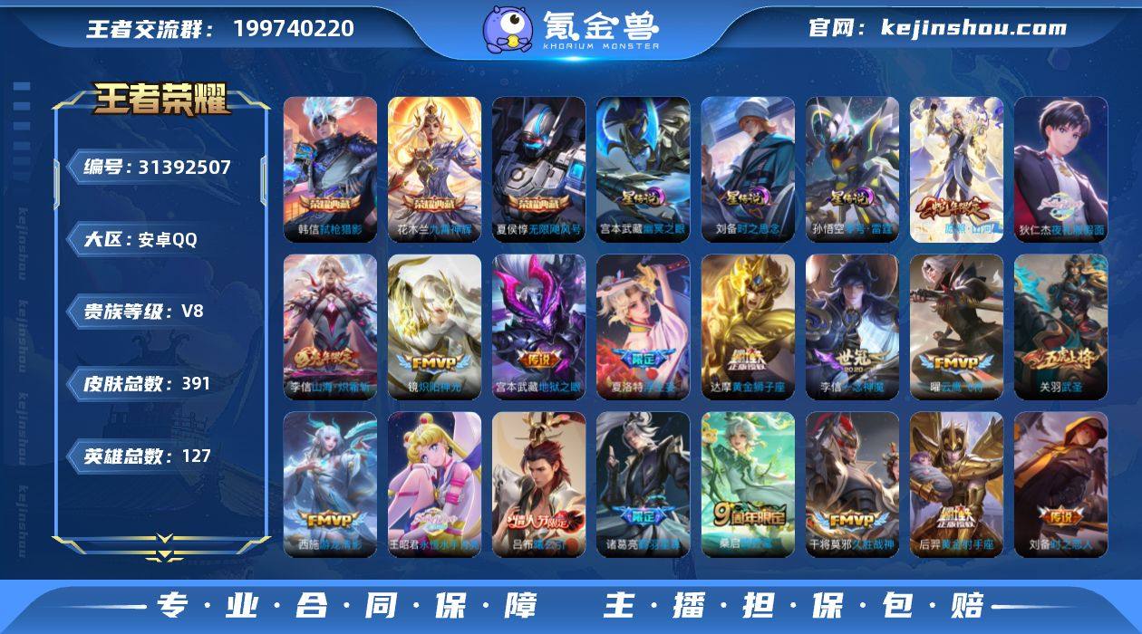 【万战金标白起 金标宫本武藏 金标刘禅 金标夏侯惇】安卓手Q291区391皮3典藏25传说0无双V8 营地ID541206715非凡王者【荣耀典藏】:弑枪猎影,九霄神辉,无限飓风号【优质限定皮肤】:山海·炽霜斩,武圣,神威,至尊宝【传说皮肤】:神树通天,愿照·山河定,浮生妄,鸣野蒿,惊梅引,曦玄引,时之恋人,夜礼服假面,永恒水手月亮,云鹰飞将,鹤羽星尊,炽阳神光,山海·炽霜斩,星穹之声,碎云,游龙清影,绛天战甲,启明星使,零号·赤焰,武圣,一念神魔,地狱之眼,黄金射手座,久胜战神,黄金狮子座【史诗皮肤】:灵蛊蚀心,电玩小子,九幽镇关,万灵启世,罗小黑战记,巫礼祀神,百相守梦,龙之律动,万物之道,苍鳞隐世,暗夜贵公子,星界战将,月团寄思,诗语江南,天秀·启明,百相守梦,遇见飞天,陌上桑,箭羽风息,破空之剑,幽灵船长,时之恋人,夏日便利店,绅士熊喵,乱世虎臣,紫霞仙子,青焰无极,蔬乡物语,猫狗日记,航海奇遇记,燃音魔法,无限星赏官,荣光圣徽,拒霜思,百解令,心灵骇客,江河有灵,地狱燃心,地狱岩魂,镜真我赫兹,驭风魔法,电玩·爆裂旋风,缤纷独角兽,水晶猎龙者,奇幻香踪,暗夜猫娘,星界游侠,未来纪元,女仆咖啡,舞动绿茵,末日机甲,顽趣,无心,圣诞恋歌,超时空战士,神器·万象笔,乐园奇幻夜,德古拉伯爵,水果甜心,乘风破浪,五谷丰年,天才门将,魅语,永昼,黎明之约,金属风暴,天狼溯光者,蔷薇恋人,冰霜恋舞曲,默契交锋,功夫厨神,云间偶戏,御风骁将,天狼运算者,纤云弄巧,狂想玩偶喵,李小龙,冰雪圆舞曲,千年之狐,逐浪之夏,鬼剑武藏,原初追逐者,猫狗日记,苍穹之光,暗影游猎,神威,天狼绘梦者,烈魂,迷踪丽影,星夜王子,至尊宝,银河之约,天狼征服者,黄金分割率,飞衡,节奏热浪,摇滚巨星,龙骑士,繁星吟游,心灵战警,驯魔猎人,梁祝,曙光守护者,特工魅影,狮舞东方,鹰眼统帅,偶像歌手,魔术师,蓝屏警告,白昼王子,暗隐猎兽者,白龙吟,皇家上将,圣诞狂欢,朱雀志,冰冠公主,魅力...