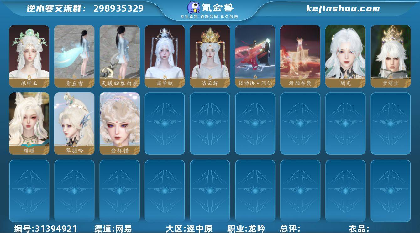 【区服】 东京梦华 【战力值】 154.16 【职业】 龙吟 【馆藏】 6级 【衣品值】 259530 【国色值】 68790 【已用天赏石】 19 【天霓染数量】 1 【充值称号】 把酒临风 【累计充值】 17865元 【剩余赠礼额度】 64767纹玉 【天霓染】 山青见雨*1 【灵韵内功】 汲川, 点明炉, 止水诀 【副本外观】 白夜拂雪*2, 星落月皓, 紫宿宸极 【天赏外观】 琅轩玉, 霜华赋, 洛云辞, 绯曜, 梦前尘, 璃光, 翠羽吟, 金杯错, 蝴蝶武器, 轻功诀问仙, 绯烟香袅, 青丘雪, 天曦四象·白虎 【天赏祥瑞】 迷重川 【祥瑞坐骑】 萌莓, 骋风叱焰, 贺岁喜狮, 呆宝, 布丁, 假面, 鸿火, 风行·江湖景, 风行·世间情, 风行·万灯明, 云螭·再浪一夏, 龙衔瑞焰, 风行·谦谦有礼, 金冠鼠鼠, 狂霸天, 秋霜橘, 沉木行马, 星河转·银昼, 星河转·金夕, 花仙鼠鼠, 粉黛娇, 伯力, 咩郎, 瓜皮, 阿德, 霸霸, 墨流云·玄色, 墨流云·朱红, 墨流云·靛青, 奔虹赤, 木小马, 绒绒夜, 牛奶酥, 帝皇驹, 隐云涧, 四方游士, 逍遥游, 空山闲, 犬威哮月·沧, 玉霄飞练 【商城外观】 甜宙漫游, 佛心膳缘, 苍蓝微风, 桃花雪, 甜梦晴海, 云锦天香, 金缕漠歌, 烹椒听雀, 音律织光, 焕曜旋煌, 裁花信, 海镜霜繁, 修月碧海, 神戬天威, 珊枝琢浪, 曦凤嘉煌, 天籁闻歌, 灵珠饮月, 闻鹤九皋, 跃动心芒, 灵娲泽生, 逍遥千风, 灼金喵影, 云腾游雾, 幽蝶眠花, 蝎影度月, 灵语星彩, 绯月狼舞, 白夜俘获, 绒粉美梦, 悬蛛结心, 川峦游墨, 芳汀花影, 空冥铃语, 难负君思, 帝皇铠甲, 白露惑心, 玄喵夜行, 云汉逢夕, 鳞骨逢幽, 白尘游昼, 星宫遐音, 贪狼摄星, 青林雀舞, 开阳执戈, 紫微御宵, 衣香鬓影, 逆鳞濯月, 朱焰羽裳, 瀚渊龙炎, 曦照东晖, 烽火浮生, 赤狐魅语, 醉墨狂歌, 广寒游仙, 苍龙云岫, 鱼龙灵泽, 白灵雪魅, 灵鹿瑶羽, 墨隐千秋, 青蕊云烟, 盈盈星河, 轻功诀伞梦 【配饰】 娇狐曳, 灵尾绰...