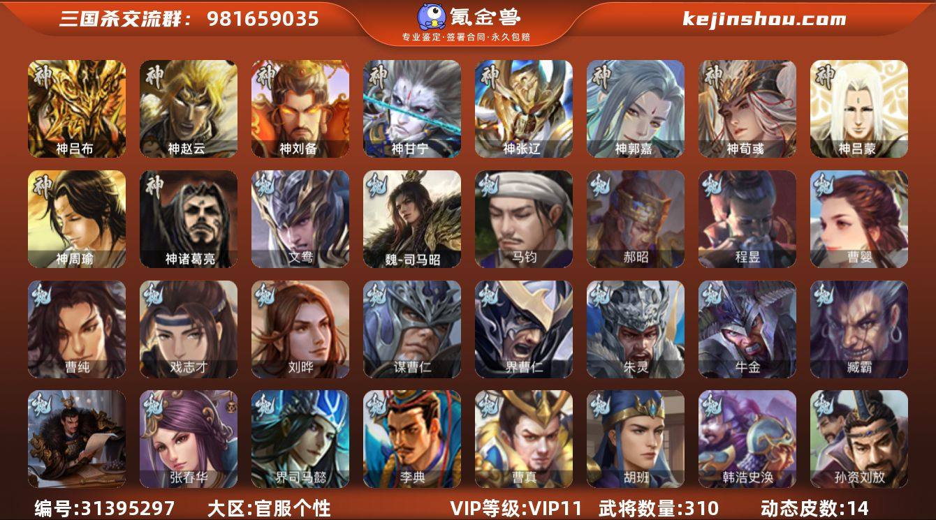 VIP等级: VIP11 官阶: 骠骑将军 武将数量: 310 动态皮肤数量: 14 神将: 神甘宁,神郭嘉,神刘备,神吕布,神荀彧,神张辽,神赵云,神吕蒙,神周瑜,神诸葛亮 魏国武将: 刘晔,戏志才,曹纯,曹婴,程昱,郝昭,马钧,魏-司马昭,文鸯,张辽,SP蔡文姬,SP曹仁,SP关羽,SP姜维,卞夫人,蔡贞姬,曹昂,曹操,曹冲,曹洪,曹丕,曹仁,曹叡,王异,张恭,鲁芝,曹休,界曹植,满宠,荀攸,王基,钟繇,郭嘉,荀彧,杜畿,界郭嘉,崔琰,界曹丕,界荀彧,朱灵,吕虔,界王异,界许褚,界郭淮,华歆,陈群,界典韦,袁涣,李通,乐进,辛宪英,谋曹仁,郭淮,郭皇后,毌丘俭,夏侯惇,曹植,司马朗,界曹操,许褚,界张辽,张郃,钟会,文聘,曹彰,界夏侯惇,诸葛诞,司马懿,甄姬,界徐晃,徐晃,界曹仁,孙资刘放,韩浩史涣,胡班,曹真,典韦,夏侯渊,李典,于禁,邓艾,界司马懿,张春华,孟达-魏,臧霸,牛金,朱灵(国战) 蜀国武将: 花鬘,谯周,徐庶,吕凯,界关羽,邓芝,界伊籍,费祎,严颜,界黄月英,界张嶷,赵云,张松,李丰,界刘备,刘封,谋庞统,黄月英,刘巴,关羽,吴懿,祝融,张飞,黄皓,魏延,界周仓,马忠,界法正,糜夫人,界孟获,刘禅,界赵云,张翼,关银屏,界祝融,SP孙尚香,SP徐庶,卧龙诸葛,周仓,简雍,界关兴张苞,诸葛亮,界张飞,界卧龙诸葛,法正,赵统赵广,陈到,界马岱,关平,马岱,界庞统,庞统,诸葛果,马谡,马超,廖化,关兴张苞,孟获,夏侯氏,姜维,黄忠,刘备,李严,马良,刘谌,甘夫人 吴国武将: 界徐盛,文鸯,潘濬,周泰,全琮,吕蒙,界孙尚香,界顾雍,大乔小乔,桥公,谋周瑜,许贡,丁奉,界全琮,蒋钦,顾雍,孙亮,界朱治,孙休,严畯,界孙权,祖茂,界虞翻,界吕蒙,陆抗,孙登,凌操,朱治,孙尚香,程普,大乔,韩当,陆逊,诸葛瑾,朱然,吕范,太史慈,周妃,虞翻,界孙坚,界黄盖,孙鲁班,界周瑜,界潘璋马忠,卫温诸葛直,孙权,谋小乔,鲁肃,界甘宁,吴国太,甘宁,界大乔,孙坚,孙鲁育,凌统,岑昏,步练师,周瑜,小乔,潘璋马忠,黄盖,吕岱,孙策,界陆逊,界周泰,徐盛,张...