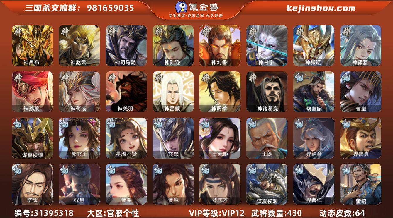 VIP等级: VIP12 官阶: 大将军 武将数量: 430 动态皮肤数量: 64 神将: 神甘宁,神郭嘉,神刘备,神陆逊,神吕布,神司马懿,神孙策,神荀彧,神张辽,神赵云,神关羽,神吕蒙,神周瑜,神诸葛亮 魏国武将: 戏志才,曹纯,曹婴,程昱,嵇康,界曹真,界钟会,王朗,王元姬,文鸯,唐咨-魏,张辽,SP蔡文姬,SP关羽,SP贾诩,SP姜维,SP庞德,卞夫人,曹昂,曹操,曹冲,曹洪,曹丕,曹仁,曹叡,曹嵩,贾逵,王异,张恭,鲁芝,界满宠,曹休,界曹植,满宠,荀攸,王基,钟繇,蒯越蒯良,郭嘉,牵招,荀彧,阮慧,杜畿,界郭嘉,崔琰,界曹丕,界荀彧,朱灵,界甄姬,吕虔,界王异,界许褚,界郭淮,华歆,陈群,界邓艾,界曹休,谋甄姬,袁涣,李通,乐进,辛宪英,郭淮,毛玠,郭皇后,毌丘俭,夏侯惇,曹植,司马朗,谋于禁,界曹操,星周不疑,许褚,界张辽,谋徐晃,张郃,钟会,文聘,郭女王,曹彰,界夏侯惇,诸葛诞,司马懿,甄姬,杨阜,界徐晃,徐晃,界曹仁,孙资刘放,韩浩史涣,曹真,典韦,界夏侯渊,夏侯渊,李典,于禁,王双,邓艾,界司马懿,张春华,孟达-魏,臧霸,朱灵(国战),谋夏侯惇,曹髦,董昭,势董昭,谋夏侯渊 蜀国武将: 关索,花鬘,傅佥,谯周,沙摩柯,王平,诸葛瞻,谋马超,谋赵云,徐庶,界魏延,杨仪,吕凯,界关羽,界诸葛亮,邓芝,界伊籍,胡金定,费祎,严颜,界黄月英,界张嶷,赵云,张松,彭羕,李丰,界刘备,界刘禅,谋姜维,刘封,糜竺,谋庞统,黄月英,刘巴,关羽,王甫赵累,吴懿,吴班,界吴懿,界廖化,祝融,张飞,黄皓,陈震,魏延,界周仓,马忠,界法正,糜夫人,界孟获,刘禅,界赵云,张翼,关银屏,界祝融,SP孙尚香,SP徐庶,卧龙诸葛,宗预,周仓,简雍,界关兴张苞,诸葛亮,孙乾,界张飞,界卧龙诸葛,法正,赵统赵广,陈到,界马岱,关平,马岱,界庞统,庞统,诸葛果,谋张飞,马谡,马超,霍峻,廖化,关兴张苞,谋关羽,孟获,秦宓,吴苋,夏侯氏,姜维,黄忠,刘备,界马超,李严,马良,傅肜,蒋琬费祎,刘谌,彭羕(国战),甘夫人,蜀-糜芳傅士仁,SP甘夫人,势陈到 吴国武将: 界...
