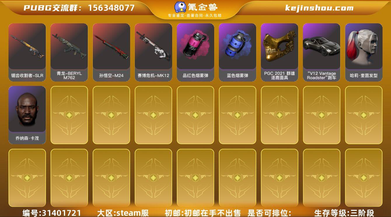 GJD13388 生存500级可排位/10级齿轮头-BERYLM762/10级锯齿收割者-SLR/2级时空使者-M416/翡翠色烟雾弹/1级瀚娜/黑鬼/渔夫帽/滑雪镜/金面具/Pigff战术突击夹克/疯狂科学电磁背包/白熊套/ 0B8DSF号 白银, 生存等级1676, 名誉等级4, 金标数量8, 聚合物7252, 枪皮数量62, [成长型] 齿轮头 - Beryl M762[10级], [成长型] 时空使者 - M416[2级], [成长型] 锯齿收割者 - SLR[10级]