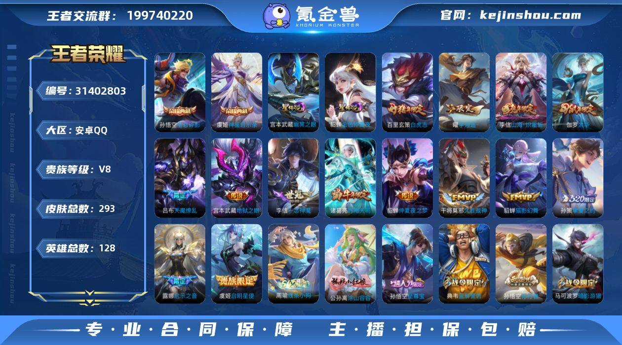 安卓Q-V8-最强王者段位-128英雄-293皮肤-2典藏皮肤-14传说-96史诗【英雄全皮】:孙权全皮,李信全皮,猪八戒全皮,影全皮,海诺全皮【荣耀典藏】:孙悟空全息碎影,虞姬神鉴启示录【传说皮肤】:李信山海炽霜斩,孙策挚爱之约,露娜启示之音,曜李逍遥 ,诸葛亮时雨天司,虞姬启明星使,李信一念神魔,伽罗太华,貂蝉猫影幻舞,干将莫邪久胜战神,百里玄策白虎志,貂蝉仲夏夜之梦,宫本武藏地狱之眼,吕布天魔缭乱【限定皮肤】:白起狰,姜子牙天穹之誓,狄仁杰阴阳师,虞姬凯尔特女王,赵云皇家上将,赵云龙胆,墨子神迹守卫,妲己时之彼端,嬴政白昼王子,孙尚香蔷薇恋人,鲁班七号狮舞东方,庄周蜃楼王,庄周高山流水,阿轲迷踪丽影,孙膑妖精王,扁鹊炼金王,白起夜都怪侠,芈月重明,芈月幻夜卜梦,吕布天魔缭乱,吕布猎兽之王,周瑜赤莲之焰,元歌云间偶戏,元歌无心,夏侯惇朔风刀,甄姬幽恒,甄姬游园惊梦,曹操烛龙,曹操天狼征服者,典韦穷奇,典韦蓝屏警告,马可波罗逐梦之星,马可波罗暗影游猎,狄仁杰魔术师,狄仁杰万华元夜,达摩星际陆战队,达摩沙漠行僧,项羽海滩派对,老夫子醍醐杖,老夫子航海奇遇记,安琪拉魔法小厨娘,程咬金演武夺筹,露娜启示之音,刘邦夺宝奇兵,王昭君凤凰于飞,兰陵王驯魔猎人,兰陵王金庭之子,亚瑟潮玩骑士王,孙悟空至尊宝,孙悟空大圣娶亲,孙悟空孙行者,牛魔御旌,后羿如梦令,后羿圣弓游侠,李元芳银河之约,李元芳云中旅人,虞姬启明星使,钟馗神迹守卫,钟馗驱傩正仪,杨玉环遇见飞天,女娲朔望之晖,干将莫邪真爱魔法,雅典娜单词大作战,雅典娜黎明之约,蔡文姬繁星吟游,太乙真人饕餮,鬼谷子原初探秘者,鬼谷子五谷丰年,诸葛亮时雨天司,黄忠烈魂,黄忠火炮绅士,苏烈千军破阵,百里玄策白虎志,百里玄策原初追逐者,百里守约朱雀志,弈星混沌棋,梦奇顽...