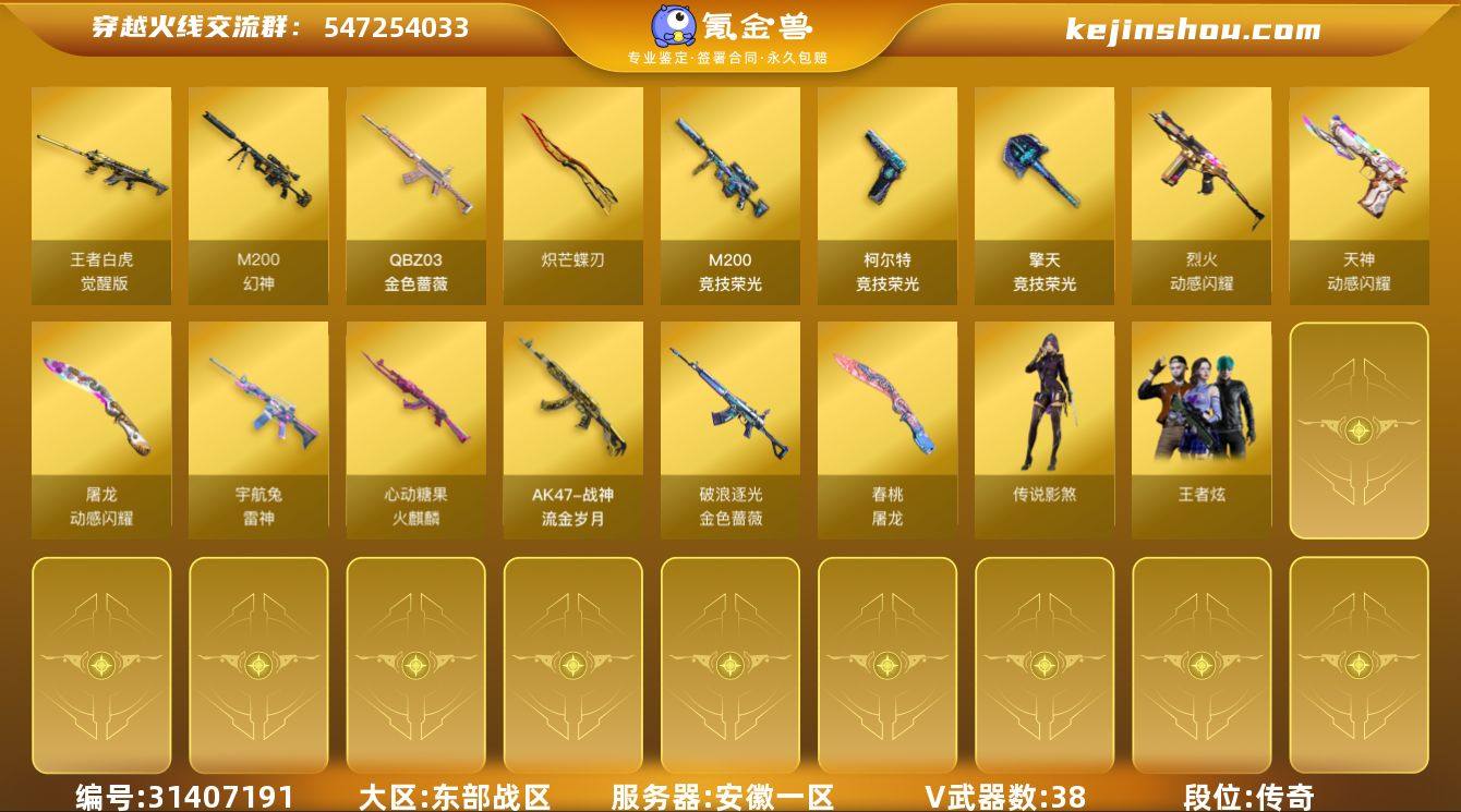 安徽一区-45V-3王者武器数-0炫金武器数 【传说角色】:传说影煞 【热门武器】:QBZ03-金色蔷薇,M4A1-青龙,M200-幻神,M200-竞技荣光,炽芒蝶刃 【皮肤】:幻神-动感闪耀 皮肤,幻神-电竞之星 皮肤,金色蔷薇-破浪逐光 皮肤,金色蔷薇-电竞之星 皮肤,裁决-运输船 皮肤,雷神-宇航兔皮肤,火麒麟-心动糖果,战神-流金岁月皮肤,天神-幻能朋克 皮肤,屠龙-春桃 皮肤 【角色】:王者炫,奇洋探员,乔伊教练,飞虎队-X,嘉年华灵狐,麻雀,潘多拉-X,斯沃特-X,铁骑荣耀,兔囡囡 【人偶武器】:迷你牛牛,迷你生化手雷*2,深渊终结者手雷 【英雄级武器】:M4A1-青龙,QBZ03-金色蔷薇,烈火-动感闪耀,王者白虎-觉醒版,M200-幻神,M200-竞技荣光,柯尔特-竞技荣光,天神-动感闪耀,马来剑-夜魔,擎天-竞技荣光,炽芒蝶刃,屠龙-动感闪耀,高爆手雷-夜魔,高爆手雷-竞技荣光*5,手雷-动感闪耀,手雷-热带奇洋,闪光弹-夜魔,闪光弹-幻灵,闪光弹-竞技荣光*3,闪光弹-云龙,闪光弹-雷霆王者-觉醒版,烟雾弹-夜魔,烟雾弹-竞技荣光*6,烟雾弹-荣耀世冠EP*2 【道具】:冰冰企鹅背包,超级背包,绿色巨人,灵魂忍者,变异宝贝,迷雾幽灵,生化弹匣,夺命之镰*2,防化服,金色流光-枪王排位,语音特效-热带奇洋,动感闪耀表情,防弹头盔,防弹衣,C4工具钳,手雷包 【特殊枪械】: