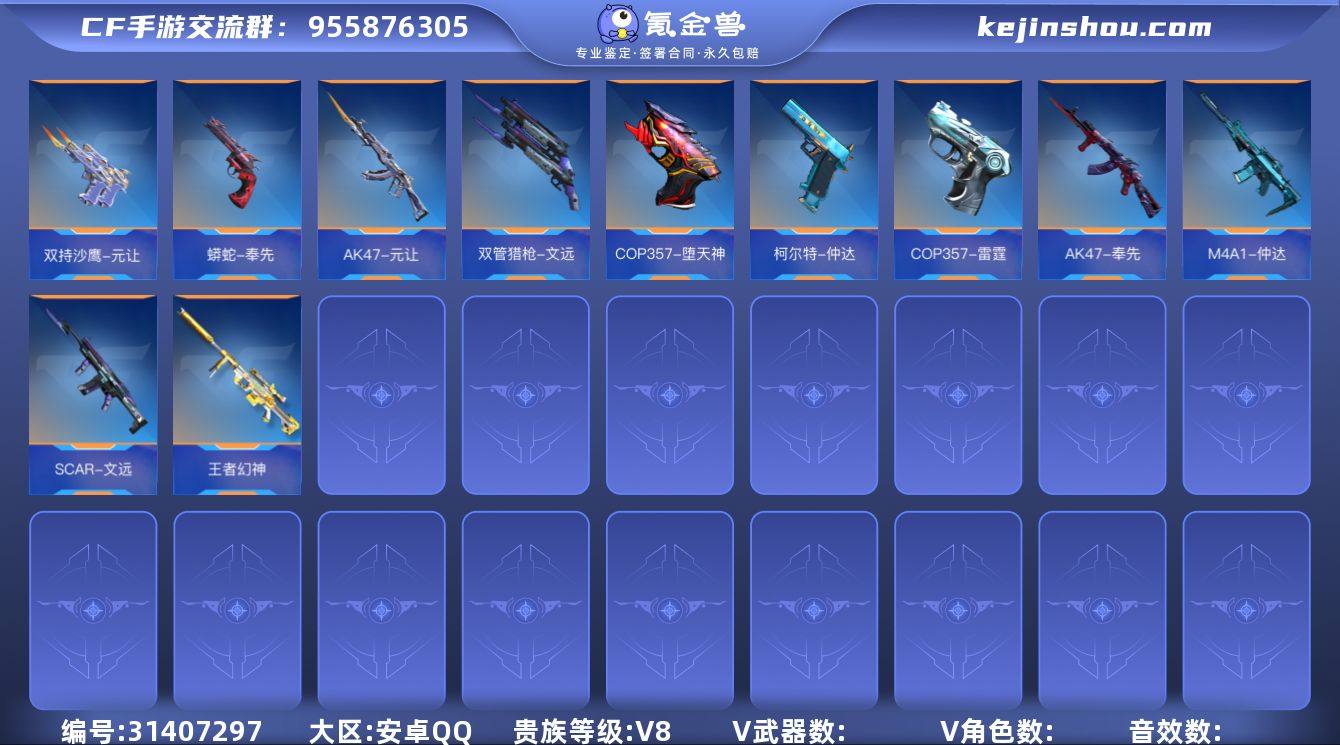 ABC11277/安卓QQ/贵8/暂不可转区/钱包注销/249V不重复/38角色/450万化/30王者武器/2COP/COP雷霆/COP堕天神/王者幻神/元让套/文远套/过载/奉先套/无双/仁德套/仲达套/过载/盖/逆骨/本初套/仲康套/王者之心/王者之影/王者之兽/王者之狱/王者之烈/王者之蝶/王者之霆/王者之迹/冰霜奇迹/王者之魂/白金血钻/王者之隐/冰霜奇迹/王者之兽手雷套*2/王者之翼闪光弹/王者之竞闪光弹/王者之影烟雾弹/【角色】/蝉/关小雨/樱/炽天使X/祝融夫人/零新生/葵/子涵/毁灭套/极光套/炼狱套/冰锋套/火力竞放套/机械迷城套/风神翼龙套/诗仙套/天神套