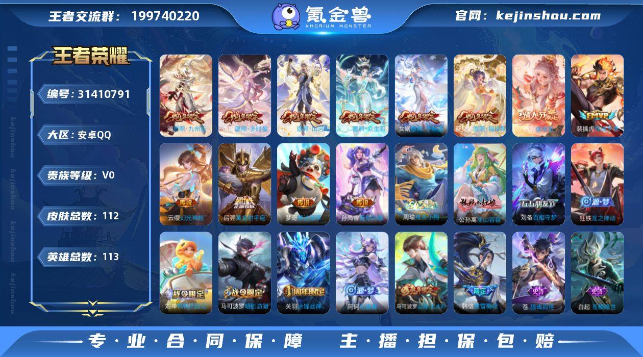 贵族等级:V0 典藏皮肤数:0 珍品无双皮肤数:0 无双皮肤数:0 珍品传说皮肤数:0 传说皮肤数:12 史诗皮肤数:34 皮肤数:112 英雄数:113 段位:钻石 卖家说:连体和平精英八粉装