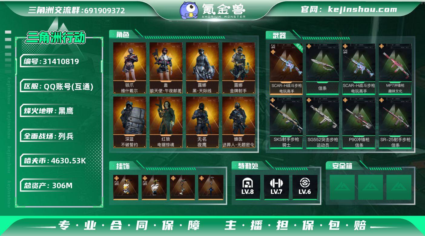 实名:可二次实名 总资产:306M 哈夫币:4630.53K 烽火地带段位:黑鹰 烽火地带等级:60 全面战场段位:列兵 全面战场等级:19 8级仓库,7级训练中心,6级靶场,6级指挥中心,1级潜水中心,3级防具台,3级工作台,3级制药台,3级技术中心,1级收藏室 战术部门等级:4 战斗部门等级:3 医疗部门等级:3 研发部门等级:3 后勤部门等级:3 曼德尔砖-气象感应:0 曼德尔砖-命运王牌:0 曼德尔砖-电玩高手:0 曼德尔砖-美杜莎:0