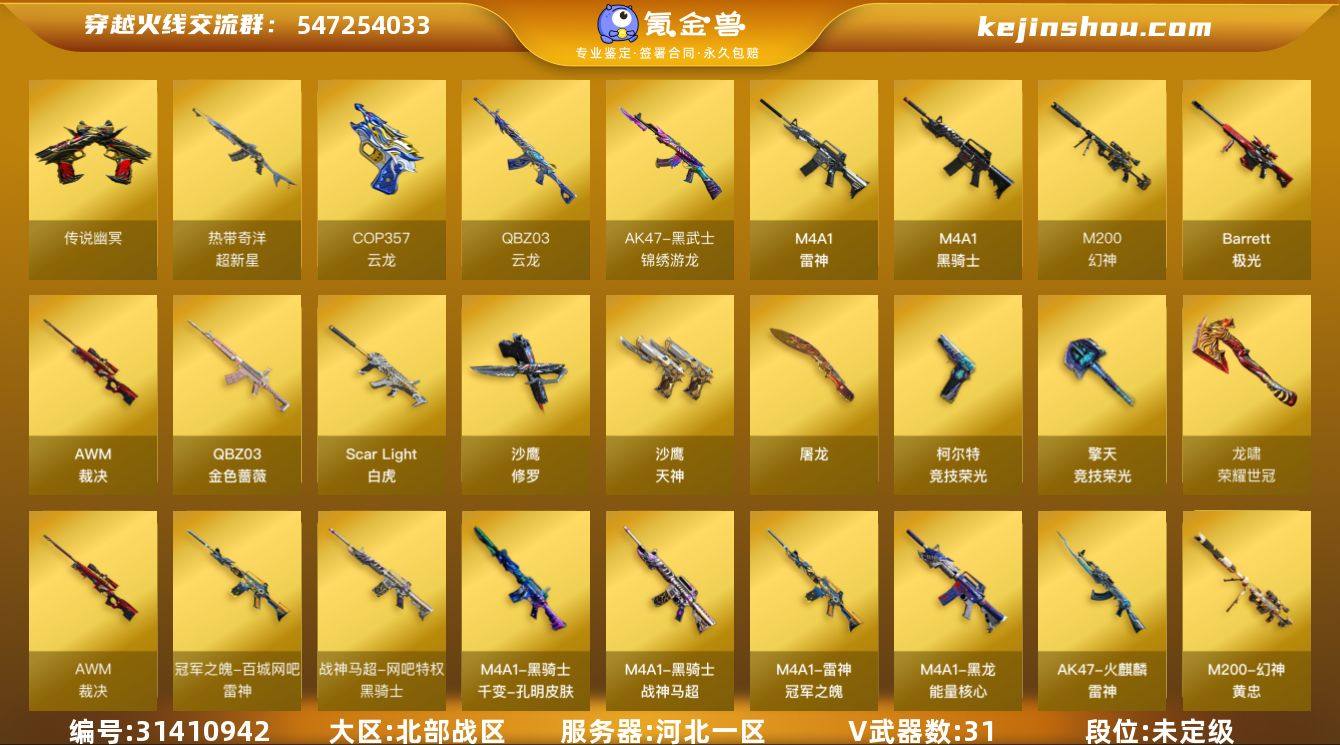 河北一区-29V-0王者武器数-0炫金武器数 【传说武器】:传说幽冥 【传说角色】:传说影煞 【热门武器】:传说幽冥,QBZ03-金色蔷薇,Scar Light-白虎,M200-幻神,M4A1-黑骑士,沙鹰-修罗*2,荣耀世冠-龙啸 【音效卡】:QBZ03-金色蔷薇-热带奇洋音效卡 【皮肤】:M200-幻神-黄忠皮肤,金色蔷薇-纸灯龙皮肤,裁决-星际旅行 皮肤,雷神-冠军之魄,火麒麟-雷神,M4A1-千变-孔明皮肤*2,黑龙-能量核心,黑骑士-战神马超 【角色】:奇洋探员,炽天使,暗夜-X,北极狐-X,初恋灵狐,飞虎队-X,风暴女,虎妞,嘉年华灵狐,猎狐者-追月,灵狐者-黄金海岸,龙儿,龙儿-小淘气,麻雀,潘多拉-X,蛇姬,铁骑荣耀,兔囡囡,游珑儿 【人偶武器】:AWM-灵狐-15周年嘉年华*2 【暴走生化】:超级对讲机 【英雄级武器】:M4A1-雷神,M4A1-黑骑士,Scar Light-白虎,QBZ03-云龙,黑武士-锦绣游龙,超新星-热带奇洋,QBZ03-金色蔷薇,Barrett-极光,AWM-裁决,M200-幻神,沙鹰-修罗*2,沙鹰-天神,柯尔特-竞技荣光,COP 357-云龙*2,屠龙,擎天-竞技荣光,龙啸-热带奇洋,荣耀世冠-龙啸,高爆手雷-竞技荣光,手雷-热带奇洋,闪光弹-竞技荣光 【道具】:亚洲杯纪念炫彩背包,奇洋探员-海龟背包,热带奇洋炫彩背包,超级背包,绿色巨人,灵魂忍者*2,变异宝贝,迷雾幽灵*2,生化弹匣,夺命之镰,防化服*4,金色流光-枪王排位*2,星辰流光-枪王排位,枪王排位28赛季金色流光,枪王排位29赛季金色流光,热带奇洋表情,防弹头盔*4,防弹衣*4,C4工具钳*3,手雷包*3 【特殊枪械】:1白虎,1黑骑士