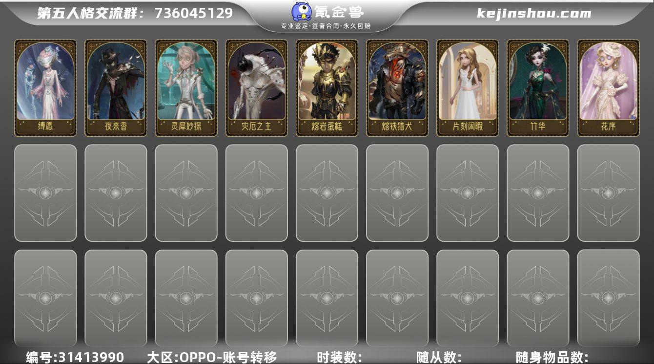 昆虫学者-缚愿,“杰克”-夜来香,“囚徒”-灵犀妙探,黄衣之主-灾厄之主,击球手-熔岩蛋糕,鹿头-熔铁猎犬,爱丽丝·德罗斯-片刻闲暇,红蝶-竹华,调香师-花序 卖家说:会正常排位直到卖出去