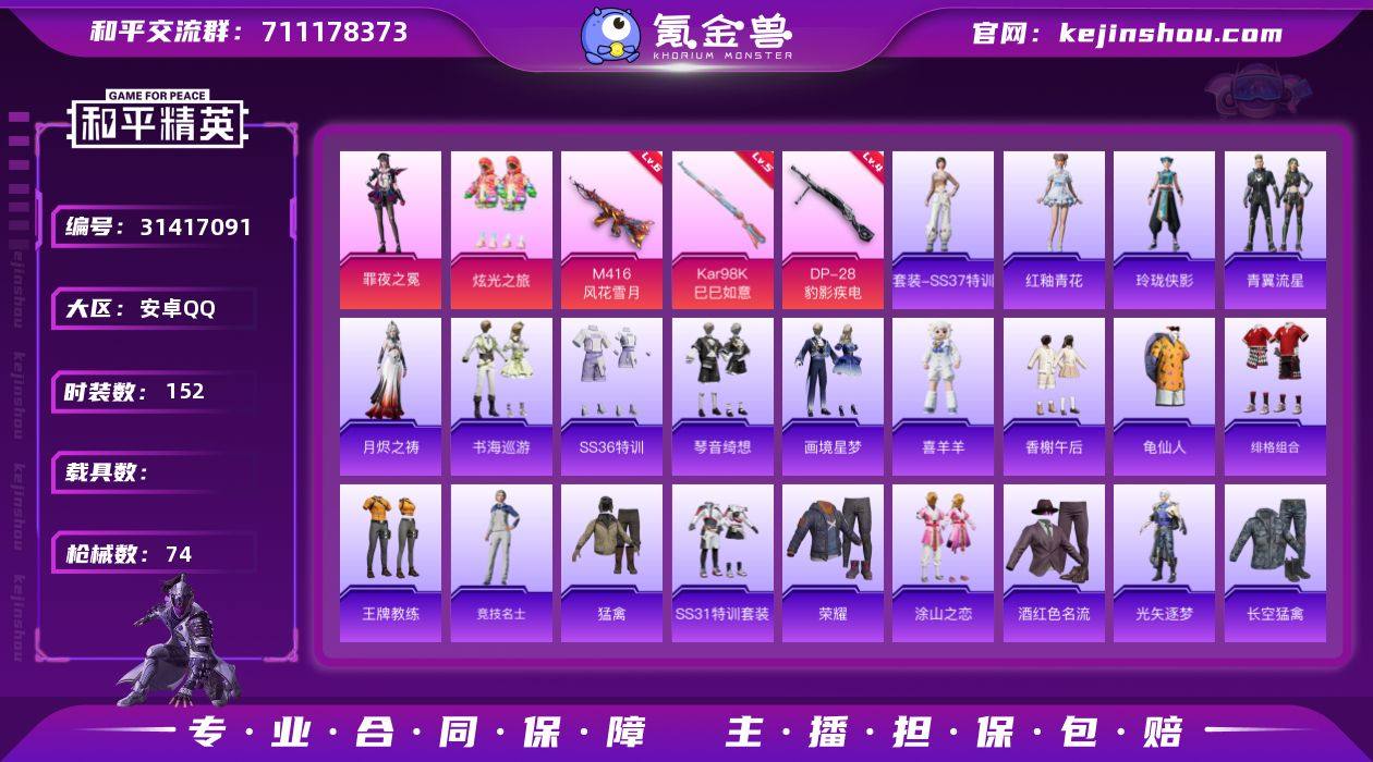 热力值:19297 时装数:152 枪械数:74 战备数:50 游戏等级:48 卓越印记:0 传奇印记:0 绝世印记:0 罪夜之冕,炫光之旅 六级M416-风花雪月,五级Kar98K-巳巳如意,四级DP-28-豹影疾电 罪夜之冕降落伞,垂柳戏鸭降落伞,莲影清波降落伞 红釉青花,SS37特训,玲珑侠影,青翼流星,月烬之祷,画境星梦,琴音绮想,书海巡游,SS36特训,喜羊羊,缤纷果语,长空猛禽,绯格组合,疯狂小兔子,光矢逐梦,龟仙人,黄色运动,酒红色名流,竞技名士,猛禽,魅力单车,懵萌河马,青玉碎影,荣耀,神气柴柴,SS21特训,SS24特训,SS25特训,SS30特训套装,SS31特训套装,SS33特训套装,豚鼠丹丹,涂山之恋,王牌教练,夏日倾情,香榭午后,玉兔迎春 GROZA-福马献瑞,AA12-G-雨过天青,AMR-雨过天青,M16A4-雨过天青,PKM-雨过天青,沙漠之鹰-雨过天青,燃烧瓶-福马献瑞,SPAS-12-福马献瑞,ACE32-冰晶雪宝,AA12-G-画境星梦,ACE32-画境星梦,M1加兰德-画境星梦,MK12-乌木金纹,MP5K-画境星梦,平底锅-画境星梦,撬棍-冰晶雪宝,燃点复合弓-罪夜之冕,AUG-紫晶流影,SPAS-12-罪夜之冕,M200-罪夜之冕,MG-36-薄荷星砂,AC-VAL-天降萌叽,AKM-破晓战魂,AWM-恐龙拽拽,DBS-彩虹符号,DP-28-彩虹符号,DP-28-未来战士,G36C-懵萌河马,GROZA-懵萌河马,M200-乌木金纹,M416-绯红前夜,M416-蓝色火焰,M416-糯团青竹,MG3-幻世战舞者,蜜獾-垂柳戏鸭,Mini14-涂山之恋,Mk47-洛神天依,莫辛纳甘-懵萌河马,P90-巳巳如意,平底锅-懵萌河马,PKM-懵萌河马,破片手榴弹-巳巳如意,QBZ-洛神天依,S12K-夜灯,S1897-炫彩节奏,S686-橘柚倾心,S686-生命誓言,SCAR-L-炫彩节奏,SCAR-L-星途旅人,SCAR-L-玉兔迎春,SKS-炫彩节奏,SKS-迅猛狂鲨,SPAS-12-太空嘟嘟,汤姆逊-天降萌叽,UMP45-蓝色火焰,UMP45-涂山之恋,UZI-啾咪啾咪,Vector-彩虹符号,VSS-彩虹符号 雨过天青降落伞,马上有福飞行器,画境星梦降落伞,SS36王牌降落伞,绿野极光降落伞,懵萌河马降落伞 实名:可二次实名