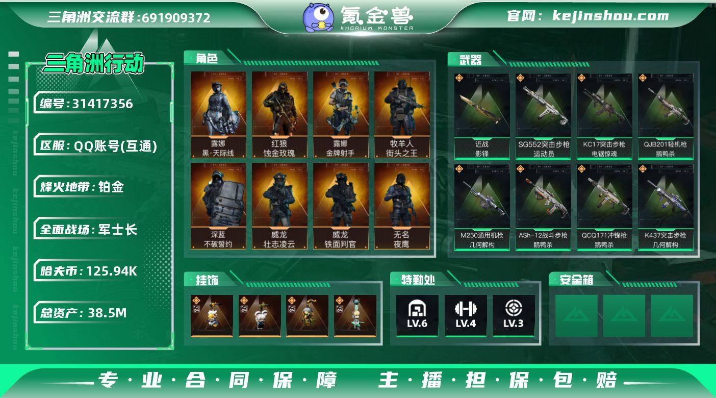 实名:可二次实名 总资产:38.5M 哈夫币:125.94K 烽火地带段位:铂金 烽火地带等级:60 全面战场段位:军士长 全面战场等级:50 6级仓库,4级训练中心,3级靶场,3级指挥中心,0级潜水中心,3级防具台,3级工作台,3级制药台,3级技术中心,0级收藏室 战术部门等级:2 战斗部门等级:2 医疗部门等级:1 研发部门等级:2 后勤部门等级:2 曼德尔砖-气象感应:0 曼德尔砖-命运王牌:0 曼德尔砖-电玩高手:0 曼德尔砖-美杜莎:0