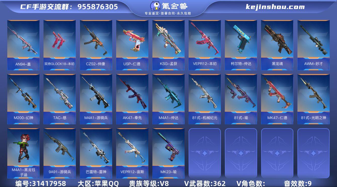 贵族等级:V8 王者武器数:14 v武器数:362 王者HeartShotⅠ期,怒至尊,心至尊,魄至尊 卖家说:瑜、81全部有、三国三幻神都有,排位强势枪、黑龙魂宙斯生化枪