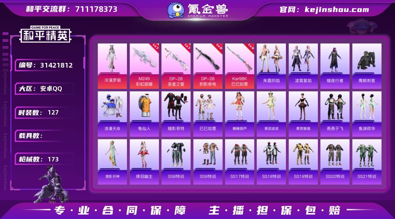 安卓 手Q-1粉装-5特效枪-0载具-0粉色飞行器-49837热力值-6王牌印记-127套装-173枪皮【热门品类】:套装-浪漫天命,套装-暗夜行者,套装-龟仙人,套装-暗影哥特【粉色套装】:角色-冷漠罗丽【粉色枪皮等级】:Kar98K-巳巳如意(五级),M249-彩虹甜喵(七级),DP-28-圣堂之誓(七级),DP-28-豹影疾电(五级)【粉色枪皮】:Kar98K-巳巳如意,Mk14-福马献瑞,M249-彩虹甜喵,DP-28-圣堂之誓,DP-28-豹影疾电【粉色降落伞】:筑梦精灵降落伞,太空嘟嘟降落伞,彩虹甜喵降落伞【稀有套装】:套装-龟仙人,套装-巳巳如意,套装-糖糖葫芦,套装-青团波波,角色-摩登魅猫,套装-燕燕于飞,套装-鱼渊荷华,角色-猎影月神,角色-绛羽幽主,套装-朱霞炽焰,套装-凌霄紫焰【稀有枪皮】:AKM-夜灯,AKM-彩虹符号,AKM-灼热熔岩,AKM-环太平洋,AKM-破晓战魂,AKM-虎虎生威,M16A4-幻世战舞者,M16A4-甜心亚梦,M16A4-红色方程式,M16A4-蓝色火焰,SCAR-L-炫彩节奏,SCAR-L-玉兔迎春,SCAR-L-红色方程式,M416-夜灯,M416-紫翼圣骑,M416-绯红前夜,M416-蓝色火焰,GROZA-异彩先驱,GROZA-影袭,GROZA-田园牧歌,GROZA-紫翼圣骑,AUG-耀粉歌者,QBZ-彩虹符号,QBZ-洛神天依,QBZ-飞驰魅影,M762-天降萌叽,M762-奇异狩猎者,M762-牛气冲天,M762-瑞龙福将,M762-第五大道,AC-VAL-天降萌叽,AC-VAL-彩虹甜喵,AC-VAL-甜心亚梦,蜜獾-垂柳戏鸭,蜜獾-天降萌叽,蜜獾-娇憨猪猪,蜜獾-绯穹魔姬,ARX-凌霄紫焰,UZI-啾咪啾咪,UZI-娇憨猪猪,UZI-影袭,UZI-红色方程式,UMP45-生命誓言,UMP45-蓝色火焰,Vector-田园牧歌,汤姆逊-庄周梦蝶,汤姆逊-异彩先驱,汤姆逊-环太平洋,汤姆逊-耀粉歌者,MP5K-异彩先驱,JS9-凌霄紫焰,P90-飞驰魅影,P90-巳巳如意,Kar98K-炫彩节奏,Kar98K-金玉无双,Kar98K-飞驰魅影,M24-影袭,SKS-炫彩节奏,S...