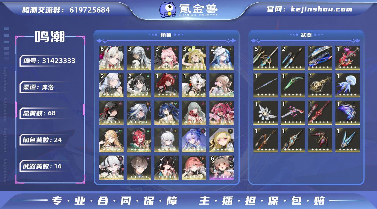 61珂莱塔,21守岸人,21今夕,11吟霖,赞妮,菲比,家主,弗洛洛,嘉贝,椿,长离,卡提01,00尤诺折枝露帕千咲相里要,常驻3链奶妈,3链安可,角色都大毕业技能全满