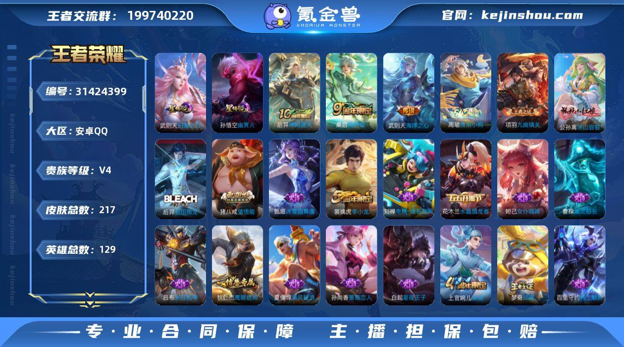 全英雄账号,皮肤216款,稀有英雄武则天+艾琳齐全。 17个王者印记,4个荣耀印记,老账号高印记。 贵族V4,全铭文多套150级,游戏体验拉满。 账号安全:可二次实名,可换绑手机,无封号无违规。 只走平台担保交易,不私下、不验号、不加联系方式,诚心买再来,非诚勿扰