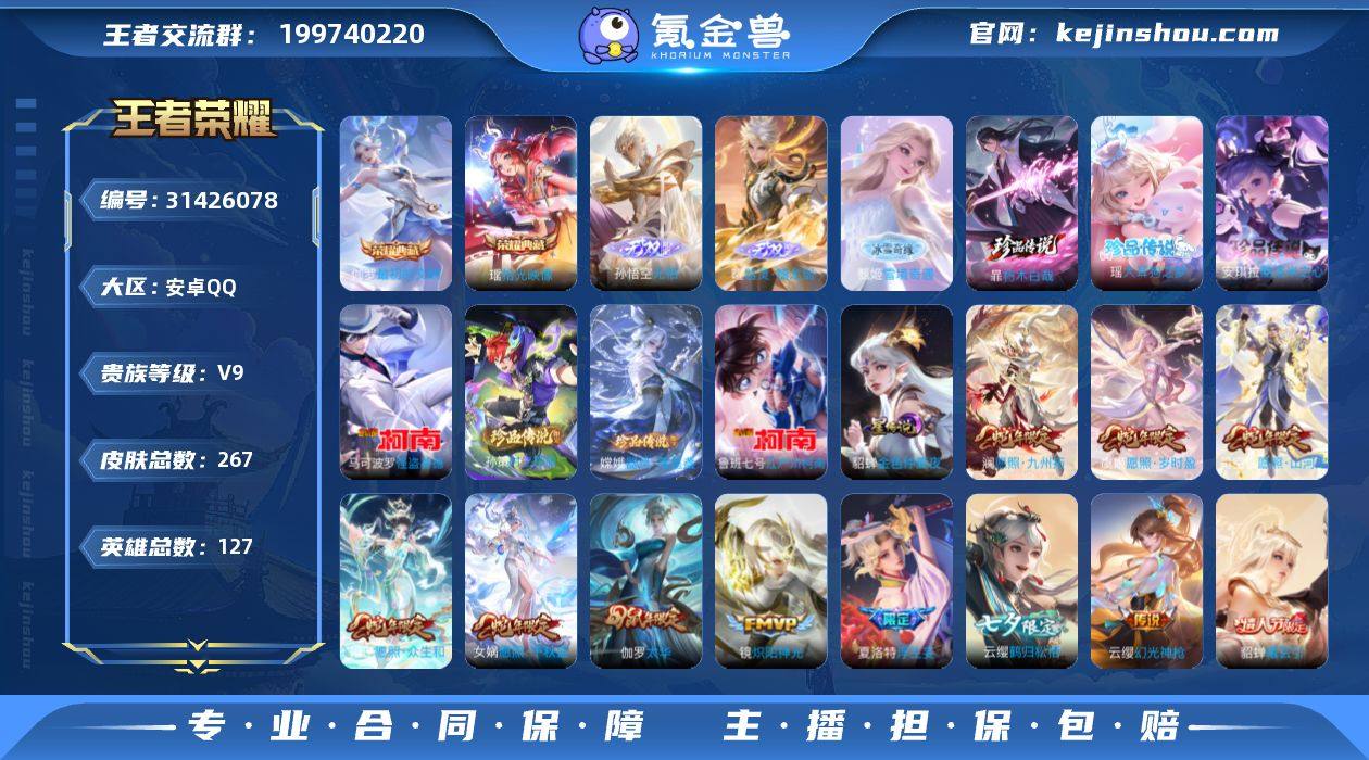 安卓QQ贵9账号 2荣耀典藏 3个无双限定 7个珍品传说限定 皮肤多限定多 英雄127个 铭文齐全 账号干净无违规 平台验号过户 安全放心 诚心要直接拍 可议价