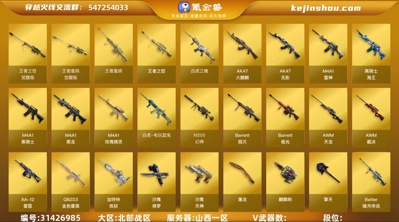 L628410 【四防艾莉莎/幻神/裁决(运输船+羽挚)/玄豹/天戎/白虎之魄/王者凌虎/白虎蓝兔/金色蔷薇(AGS19)/天罚/USP冥王/USP神工天巧/四防玄豹+荆棘+闭月羞花/皮肤:雷神-拼搏/黑骑士-摸金校尉/】 会员等级6 英雄级武器数量81 【可二次实名】 【永久包赔】 【能人脸包赔】 【VIP 6】 【能排位】 【无】 王者炫金武器4 热门武器1 英雄级武器37 稀有武器9 暴走生化5 挑战大师8 角色10 稀有皮肤26 音效卡4 投掷武器10 王者炫金武器:王者凌虎,白虎之魄,王者凰鸣,王者之怒; 热门武器:M200-幻神; 英雄级武器:屠龙,炼狱-百战金芒,M4A1-黑骑士,USP-冥王,加特林-炼狱,Scar Light-玄豹,丛林匕首-玄豹,Anaconda-玄豹,黑骑士-海王,麒麟刺-百战金芒,机械迷城-穹宇,AWM-裁决,AA-12-雷霆,沙鹰-天神,QBZ03-天罚,FAMAS G2-天戎,死神-雪域霜狐,擎天-云海游龙,M4A1-雷神,沙鹰-修罗,烈火-动感闪耀,屠龙-动感闪耀,天神-动感闪耀,USP-神工天巧,无影-神兵利器,AK47-火麒麟,QBZ03-金色蔷薇,Barrett-毁灭,白虎-电玩蓝兔,Barrett-暗月传说,M4A1-玫瑰精灵,麒麟刺,AK47-无影,M4A1-黑龙,擎天,AWM-天龙,Barrett-极光; 稀有武器:夺魂,迷你深渊冰龙,异变清道夫-蛇影双骄,迷你救赎猎手,AWM-灵狐-15周年嘉年华,加利尔ACE-零号,迷你波特博士,COP-旗袍,QBZ03-街机; 暴走生化:异变清道夫-蛇影双骄,双面神,圣拳猎手-炽雪,恶魔终结者-湮灭之柱,女皇终结者-魔龙之吻; 挑战大师:乱世-超越,冰龙粉碎者-白马银枪,激光毁灭者III-白马银枪,巨龙咆哮,次元之矛-黄金刀套,次元之矛-黄金头盔,次元之矛-黄金太阳镜,次元之矛-黄金背包; 角色:审判者,关小雨,传说艾莉莎,机械姬,荆棘,战地猎狐,王者瞳闭月羞花,职业选手,超能女侍·觉,玄豹; 稀有皮肤:火麒麟-CFSTAR,天龙-CFSTAR,修罗-CF...