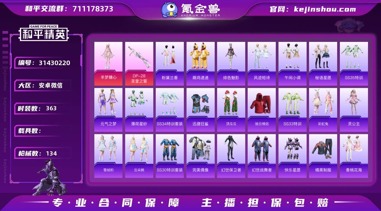 kk2355462-KK2240 安卓微信-4王牌印记-1粉装-5特效枪-33004热力值-85套装-134枪皮-迅捷狂鲨,龟仙人-地铁满天赋-研究所2级 【1粉装】角色-羊梦糖心 【5特效枪】M249-绝对恒星/3级,DP-28-圣堂之誓/7级,DP-28-豹影疾电/5级,Kar98K-巳巳如意/5级,Mk14-甜梦熊击/5级 【2稀有紫装】迅捷狂鲨,龟仙人 【84稀有时装】羊梦糖心,SS35特训,午间小调,SS33特训,SS32特训,SS36特训,彩虹兔,灵公主,雪绒豹,恋语绒绒,星影赞美诗,SS34特训,狂鲨锋刃,大橘大利,龟仙人,迅捷狂鲨,粉黛兰香,无面战甲,炫彩糖果,绯色魅影,萌鸡速递,元气之梦,风迹短诗,甜心蒙太奇,薄荷星砂,秘语星愿,超感刻度,云朵鹅,顶瓜瓜,雪国风尚,龙魂突击队,异域银装,白糯汤圆,街头风暴,星途旅人,SS30特训,战术大师,多纳泰罗,香桃花海,蝶变,SS28特训,甜梦熊熊,猎鹰,橘黑制服,红色运动,黄色运动,蓝色运动,黄色伏地魔,白色伏地魔,湖蓝色名流,黄色名流,涂山之恋,SS26特训,沙漠雄狮,空岛之星,黑色伏地魔,竞技名士,深蓝色名流,猛禽,长空猛禽,特战装甲,旭日情侣,甜蜜告白,街头潮人,魅力单车,灼焰舞者,贵族骑装,幻世战舞者,冷酷挑战者,完美偶像,蓝彩潮人,竞技达人朋克,海岛探路者,幻世保卫者,SS27特训,金耀舞者,光之冒险,神气柴柴,海盐绵绵冰,老实芭蕉,SS24特训,懵萌河马,SS25特训,快乐星愿 【133稀有枪械】DBS-乌木金纹,SCAR-L-海盐豹豹,GROZA-海盐豹豹,Mk14-甜梦熊击/5级,Kar98K-巳巳如意/5级,DP-28-豹影疾电/5级,M249-绝对恒星/3级,Mk14-冰河战士,MK20-H-乌木金纹,DP-28-圣堂之誓/7级,DBS-风迹短诗,莫辛纳甘-风迹短诗,GROZA-无面战甲,Win94-乌木金纹,MK12-风迹短诗,MK12-乌木金纹,破片手榴弹-爆破雪人,S12K-极意拳锋,MG3-霓彩脉冲,DBS-幻彩电音,蜜獾-乌木金纹,M762-云朵鹅,SVD-云朵