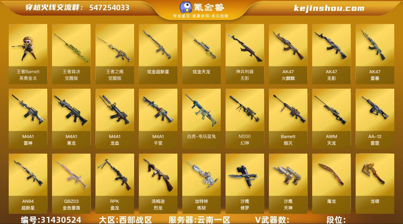 四川一区-72V-24王者武器数-1炫金武器数 【传说角色】:传说星骇 【热门武器】:QBZ03-金色蔷薇,Scar Light-白虎,HK417-朱雀,M200-竞技荣光,汤姆逊-烈龙*2,沙鹰-修罗*2 【王者炫金武器】:超新星-悦享,王者星霆,王者星光,炽渊之怒,雷霆王者之锋*2,炫金黑龙 【音效卡】:屠龙-云海游龙音效卡,M4A1-雷神音效卡,QBZ03-金色蔷薇音效卡,AWM-裁决音效卡,Scar Light-白虎音效卡 【皮肤】:幻神-荣耀世冠EP 皮肤,白虎-百战金芒 皮肤,金色蔷薇-破浪逐光 皮肤,QBZ03-荣耀世冠EP 皮肤,裁决-流光秘银,裁决-叶芒苍灵 皮肤,雷神-耀金皮肤,雷神-宇航兔皮肤,M4A1-再燃火线,毁灭-暗月,毁灭-SV-CFPLS16冠军,毁灭-虹光风暴 皮肤,黑骑士-地狱火,黑骑士-伏羲,修罗-冠军之魂,屠龙-星火燎原,屠龙-破浪逐光 皮肤,轻型军用手斧-再燃火线 【角色】:电竞教官-云悠悠,晴雅,迅捷虹喵,零·纪元,王者炫,修道士,葵-阿尔法武装,暗夜-X,北极狐-X,芳心审判者,飞虎队-X,风暴女,兰-新年限定,灵狐者-X,潘多拉-X,潘多拉-甜心教官,幽 【人偶武器】:星神-炽天使,异变清道夫-蛇影双骄,迷你律动酷熊,夺魂,迷你艾比,迷你超能女侍 【暴走生化】:超级对讲机 【英雄级武器】:AK47-麒麟,M4A1-雷神*2,AK12-天启,HK417-朱雀,Scar Light-白虎,QBZ03-天罚,黑武士-锦绣游龙,QBZ03-金色蔷薇,王者之势-觉醒版,白虎之魄-觉醒版,HK417-朱雀-电竞之星,机械迷城-穹宇,Barrett-毁灭,AWM-裁决,M200-竞技荣光,Barrett-金色蔷薇,Barrett-雷霆王者-觉醒版,炼狱-百战金芒,汤姆逊-烈龙*2,沙鹰-修罗*2,沙鹰-天神*4,COP 357-雷霆王者-觉醒版,柯尔特-竞技荣光,柯尔特-荣耀世冠EP*2,屠龙,擎天-竞技荣光*3,麒麟刺-百战金芒,雷霆王者之锋-觉醒版,丛林匕首-玄豹,高爆手雷-竞技荣光*2,高爆手雷-雷霆王...