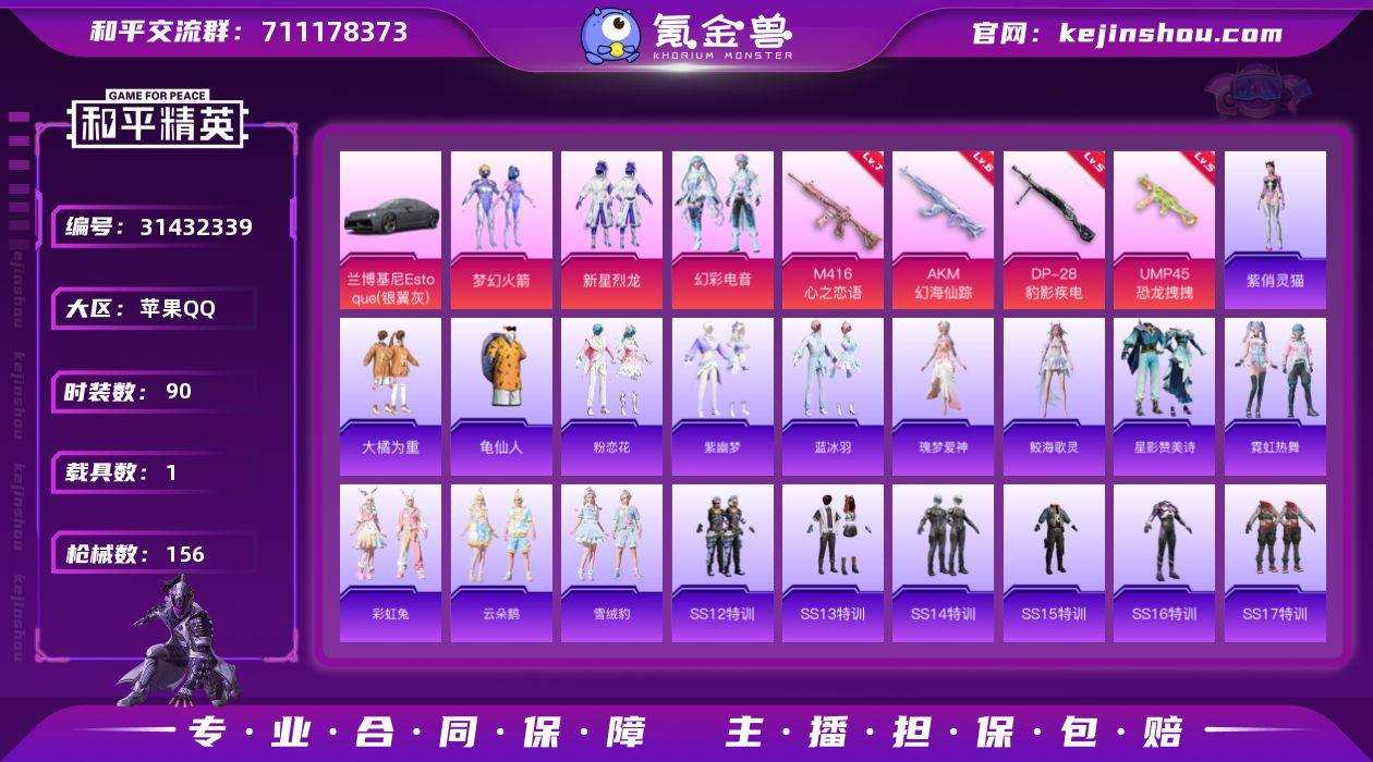 苹果【小号/梦幻火箭/M416-心之恋语(七级)】 手Q-3粉装-4特效枪-1载具-1粉色飞行器-43543热力值-8王牌印记-90套装-156枪皮 【热门品类】:粉装-梦幻火箭,套装-龟仙人,M416-星际漫游 【粉色套装】:粉装-梦幻火箭,粉装-新星烈龙,粉装-幻彩电音 【粉色枪皮等级】:AKM-幻海仙踪(六级),M416-心之恋语(七级),UMP45-恐龙拽拽(五级),DP-28-豹影疾电(五级) 【粉色载具】:兰博基尼Estoque(银翼灰) 【粉色枪皮】:AKM-幻海仙踪,M416-心之恋语,UMP45-恐龙拽拽,DP-28-豹影疾电 【粉色降落伞】:春暖花开降落伞,梦幻火箭降落伞,海渊国主降落伞,环太平洋降落伞,垂柳戏鸭降落伞,幻海仙踪降落伞,星穹咏叹调降落伞,炫彩糖果降落伞 【稀有套装】:套装-龟仙人,套装-粉恋花,套装-紫幽梦,套装-蓝冰羽,角色-瑰梦爱神,角色-鲛海歌灵,套装-星影赞美诗,套装-霓虹热舞,套装-彩虹兔,套装-云朵鹅,套装-雪绒豹,角色-紫俏灵猫,套装-炫彩糖果 【稀有枪皮】:AUG-冰晶雪宝,AKM-夜灯,AKM-彩虹符号,AKM-破晓战魂,AKM-虎虎生威,AKM-霓虹街区,AKM-玄冥寒域,M16A4-幻世战舞者,M16A4-星际漫游,M16A4-甜心亚梦,SCAR-L-炫彩节奏,SCAR-L-玉兔迎春,SCAR-L-黄金龙骨,M416-星际漫游,M416-糯团青竹,M416-绯红前夜,M416-蓝色火焰,GROZA-异彩先驱,GROZA-彩虹符号,GROZA-春暖花开,GROZA-田园牧歌,AUG-耀粉歌者,AUG-青春冒险家,QBZ-彩虹符号,QBZ-飞驰魅影,M762-天降萌叽,M762-彩虹符号,M762-牛气冲天,M762-瑞龙福将,M762-云朵鹅,G36C-星际漫游,G36C-星穹咏叹调,AC-VAL-天降萌叽,AC-VAL-甜心亚梦,蜜獾-垂柳戏鸭,蜜獾-天降萌叽,蜜獾-娇憨猪猪,UZI-天降萌叽,UZI-娇憨猪猪,UZI-炫彩节奏,UZI-红色方程式,UMP45-夜灯,UMP45-星际漫游,UMP45-蓝色火焰,Vector-田园牧歌,汤姆逊-天降萌叽,汤...
